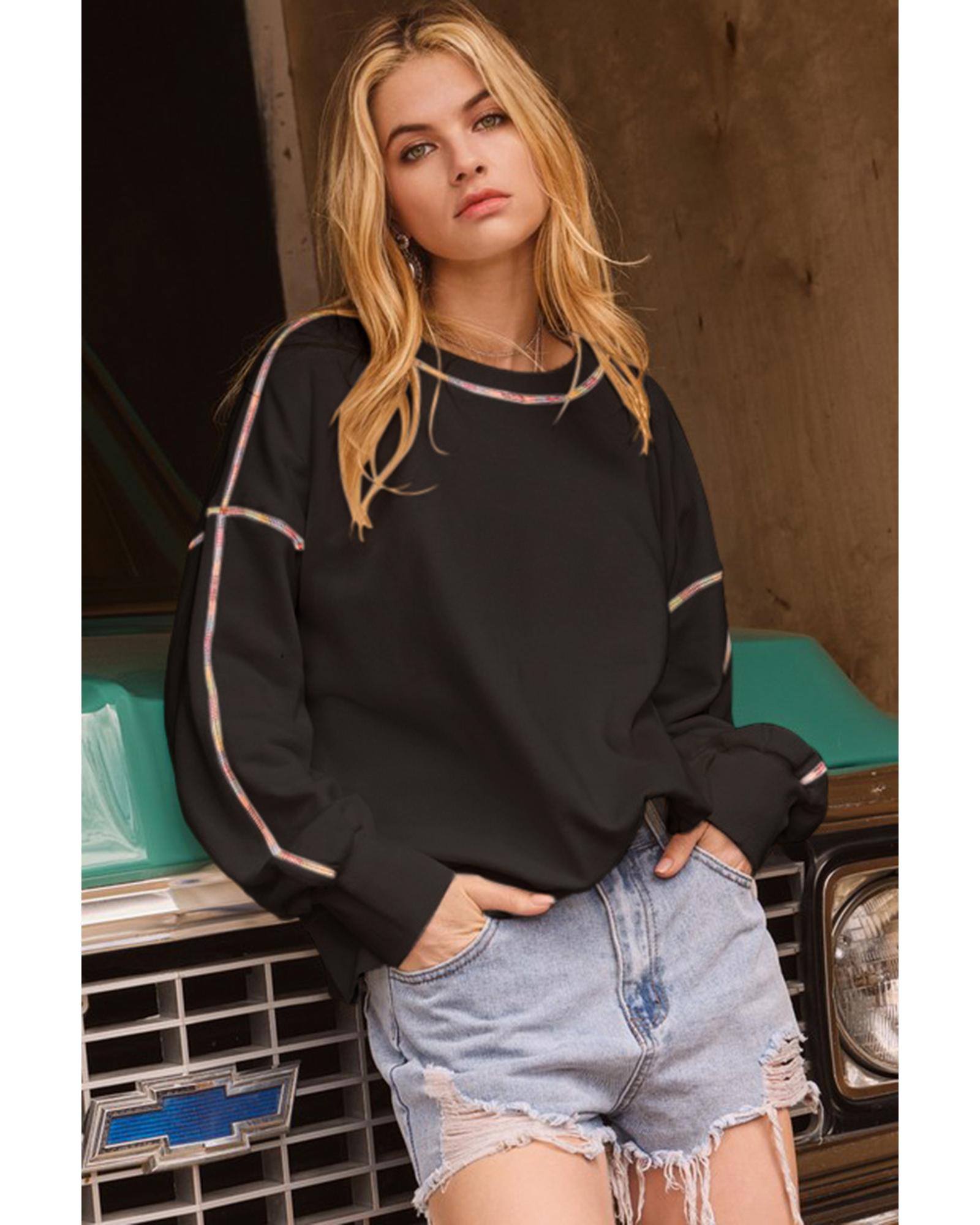 Black Contrast Rainbow Trim Drop Shoulder Pullover Sweatshirt – M