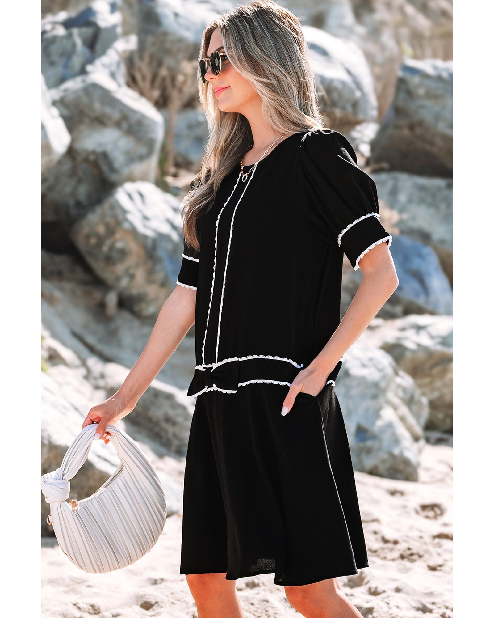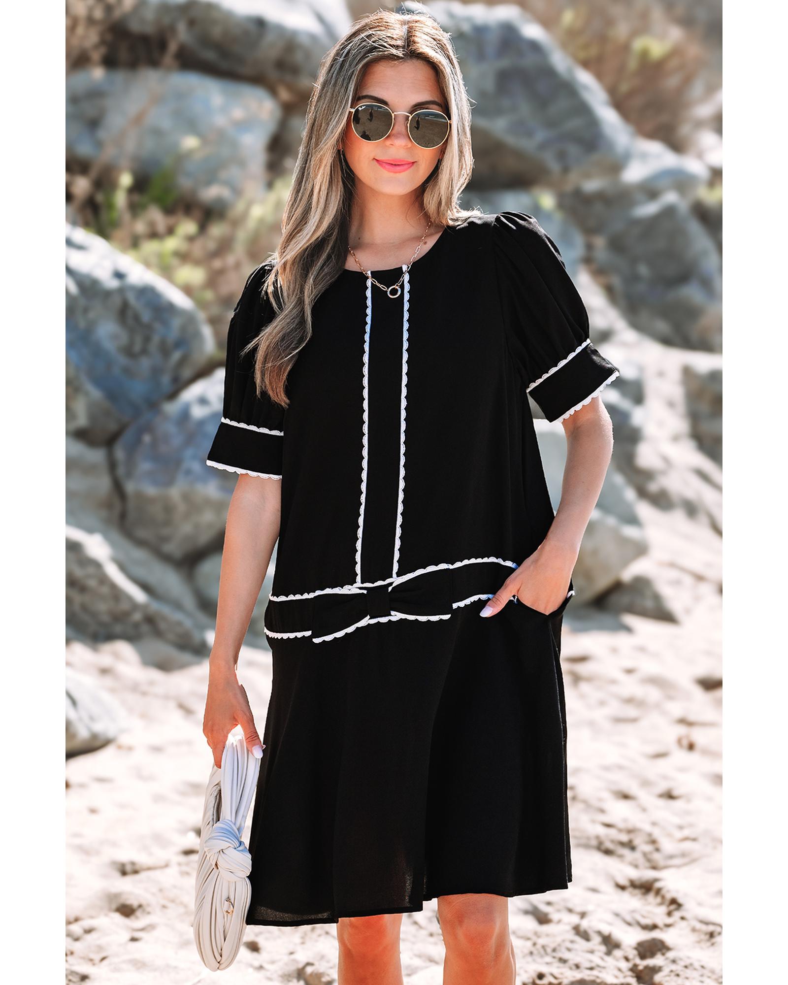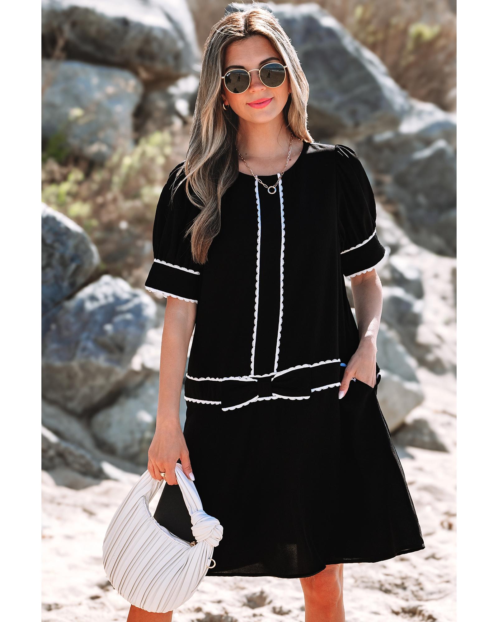 This black shift dress features elegant scallop trim details and a charming bow at the waist, making it suitable for various occasions. The puff half sleeves and crew neckline add to its stylish and comfortable design.
