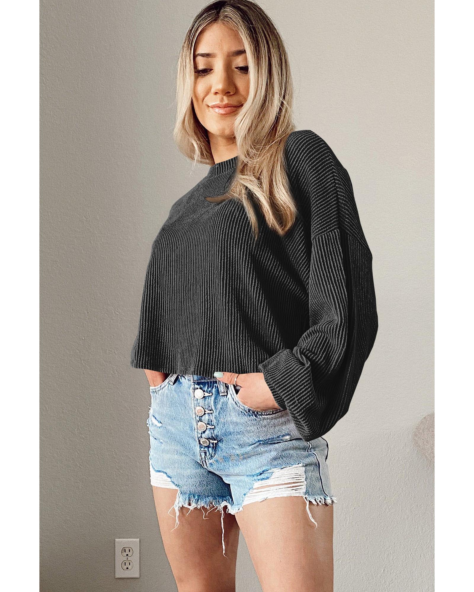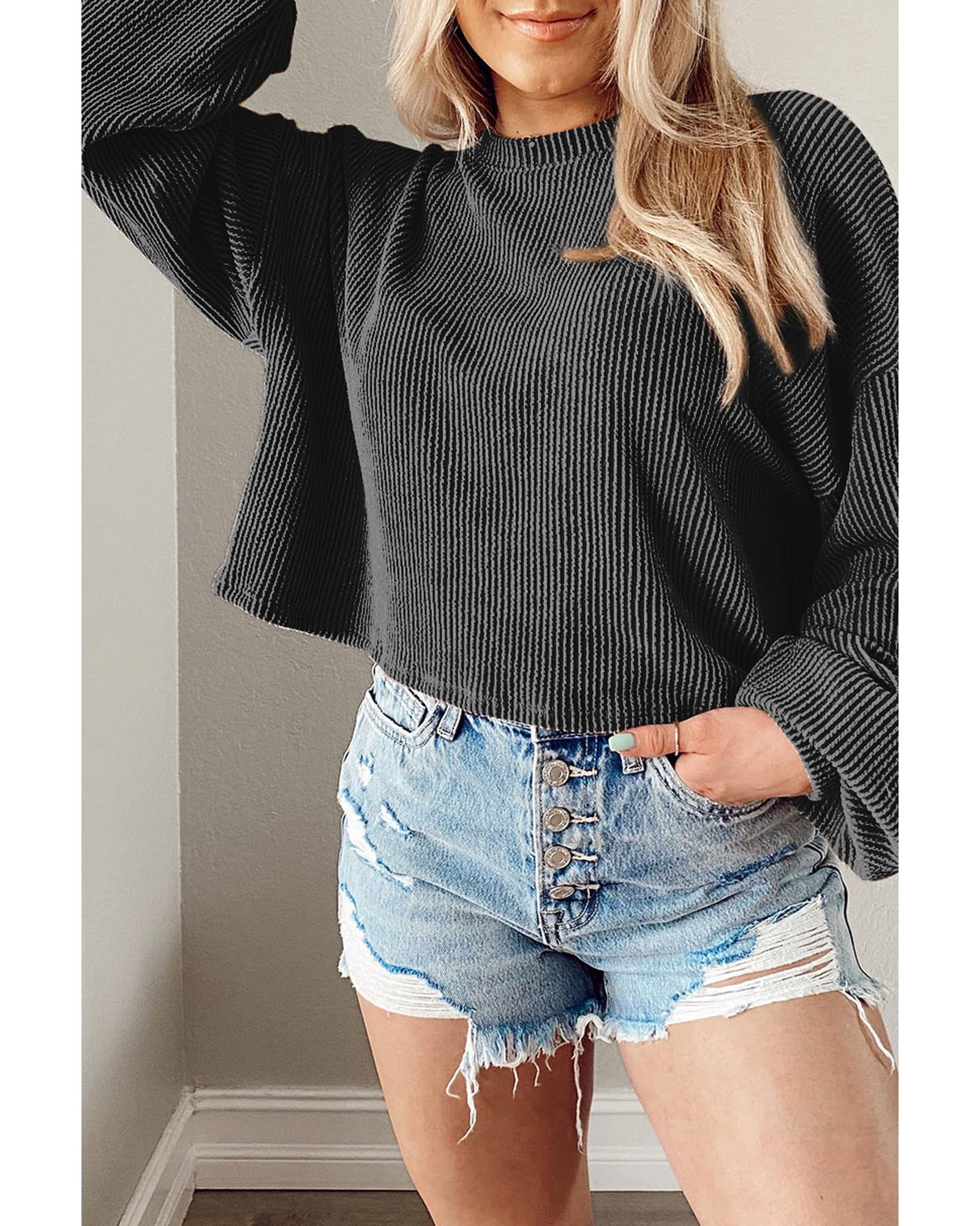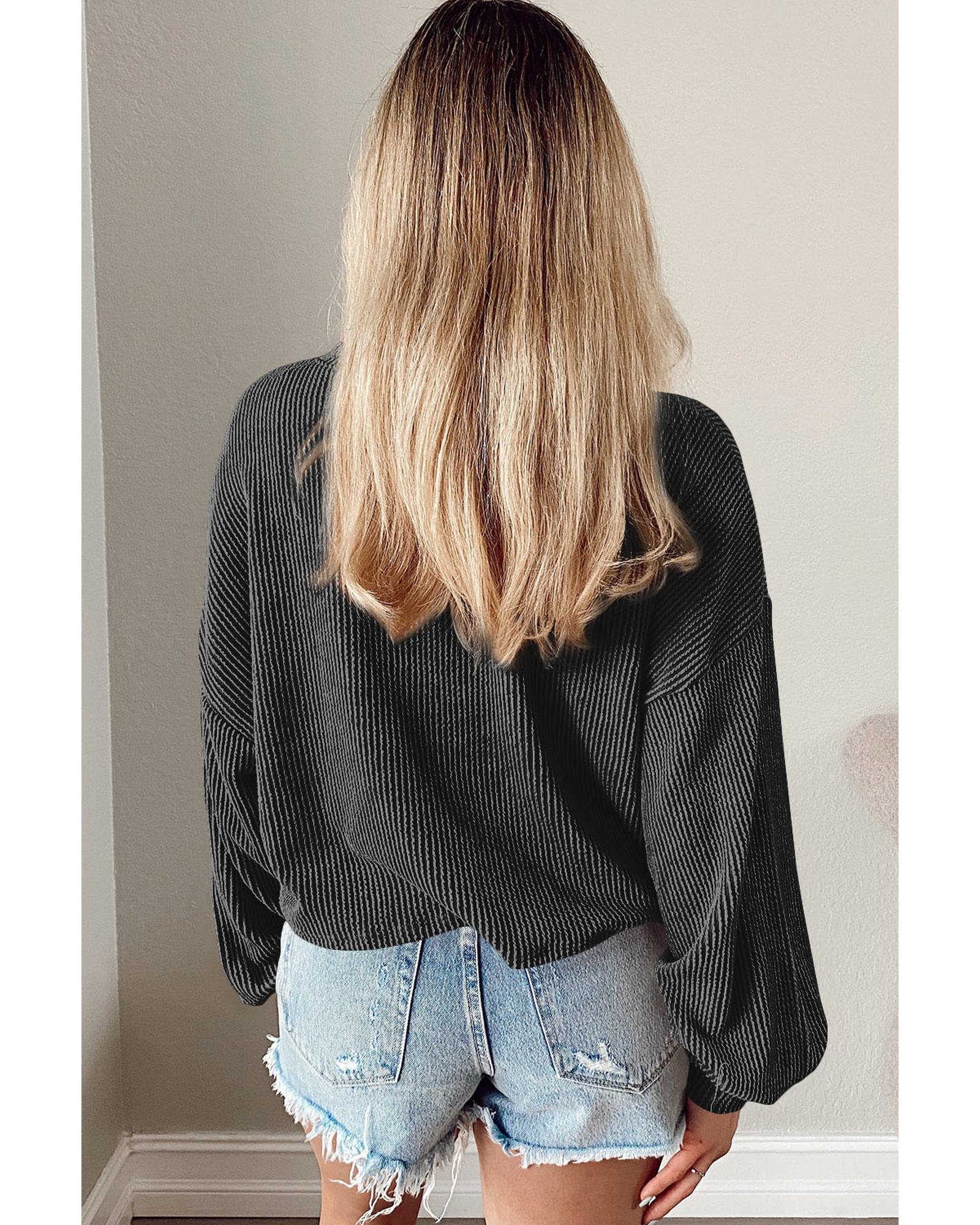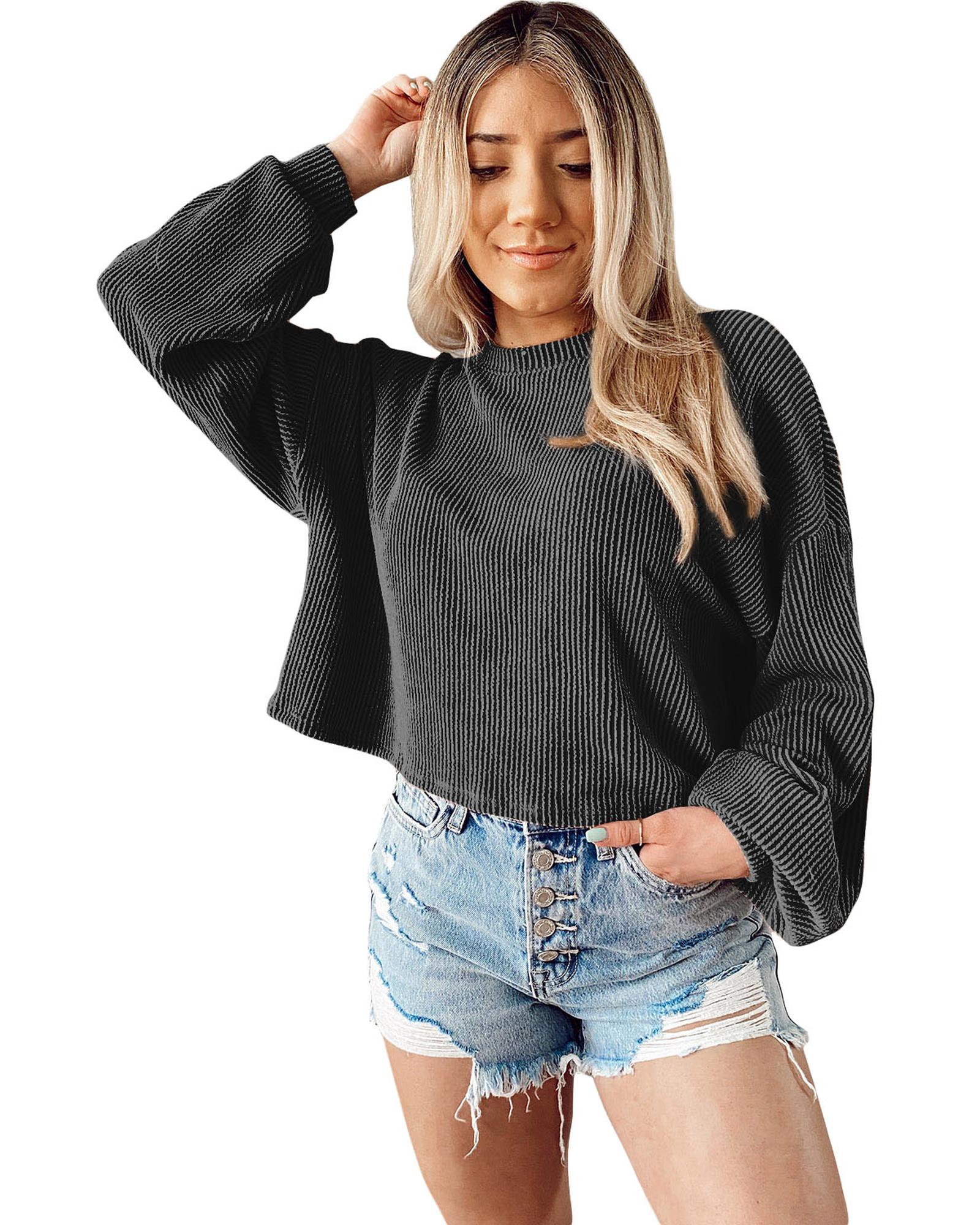 This casual long sleeve top features a stylish drop shoulder design with puff sleeves, crafted from cording fabric for a fashionable look. Its versatile solid black color makes it easy to pair with various bottoms, creating a trendy and comfortable outfit suitable for different occasions.