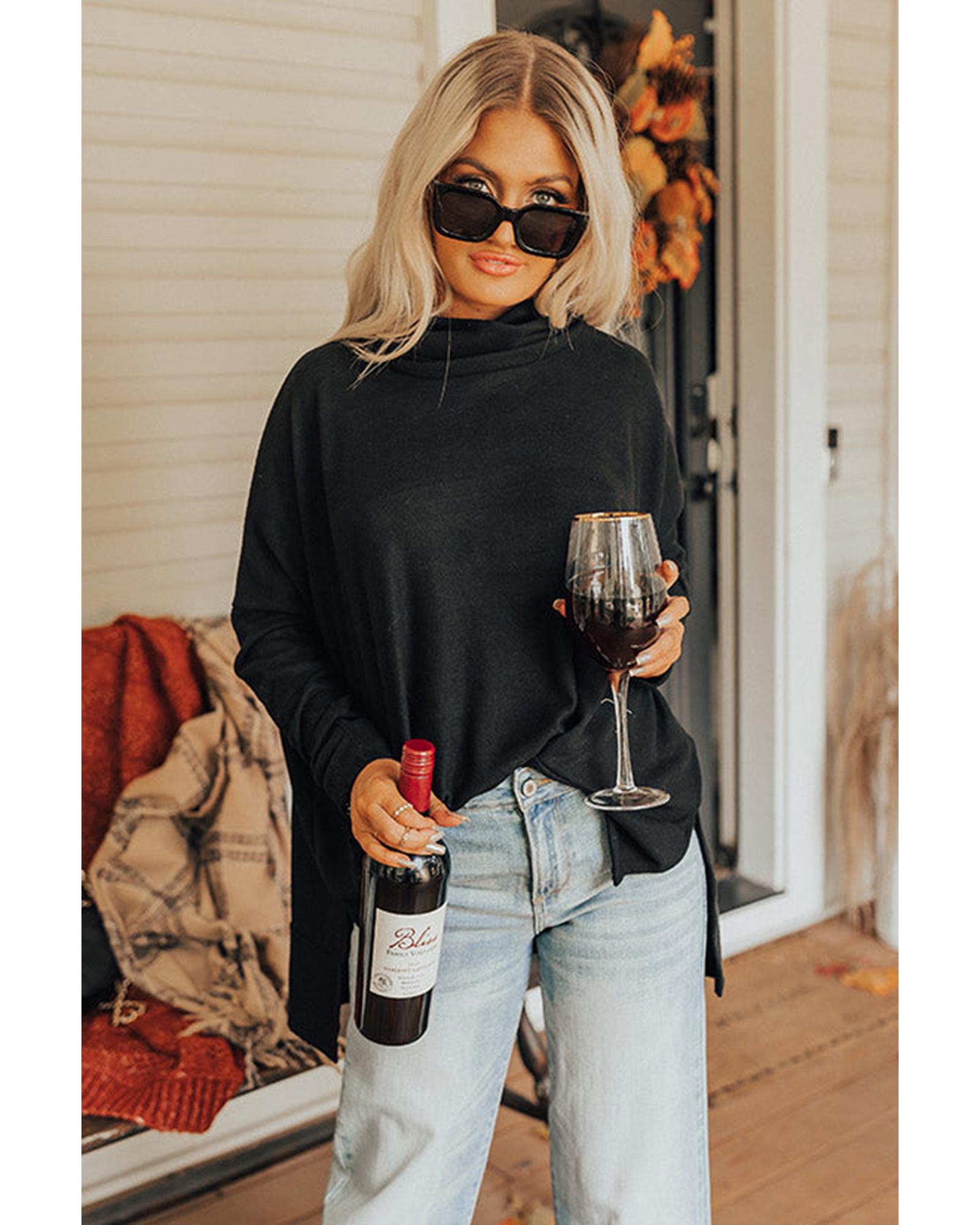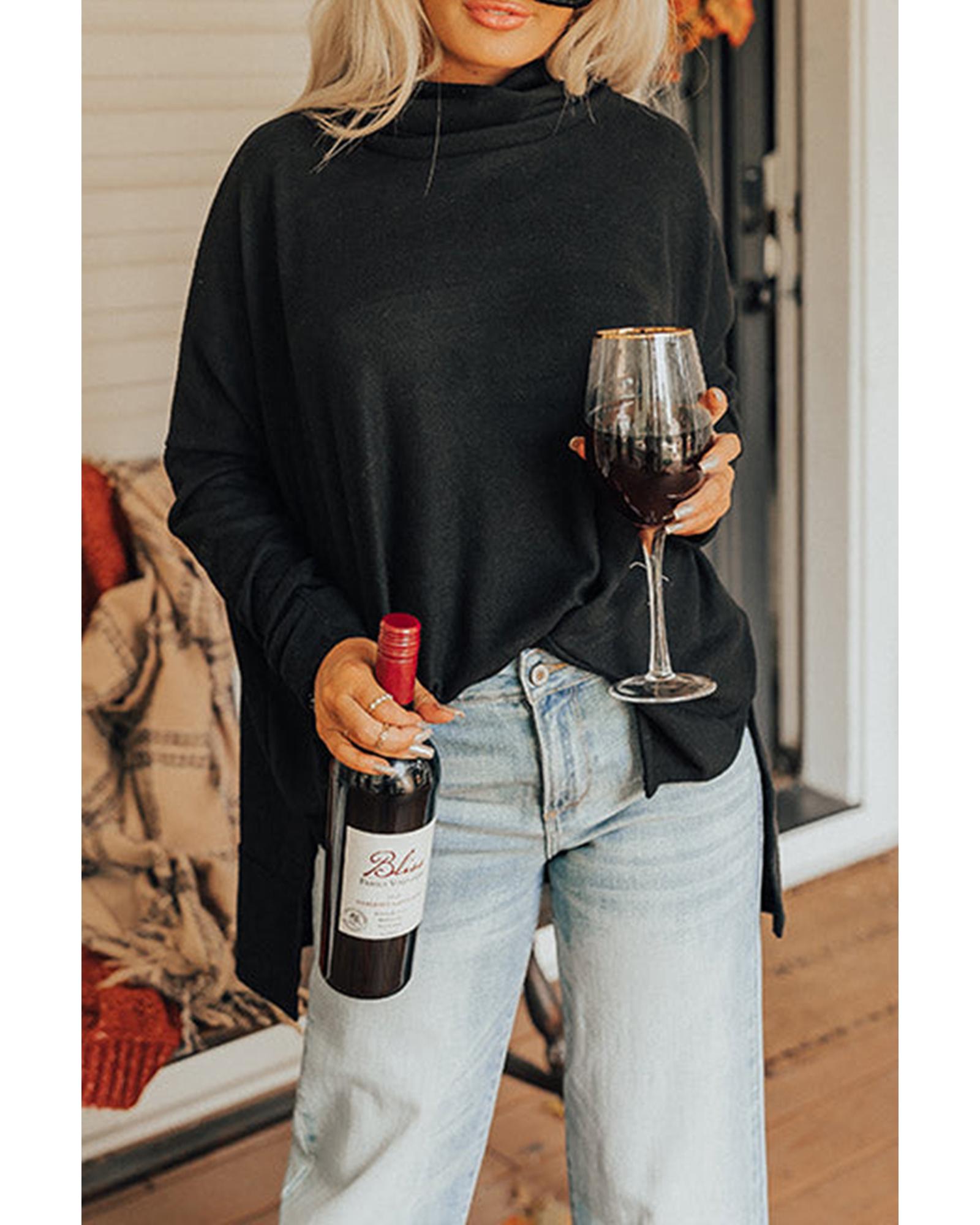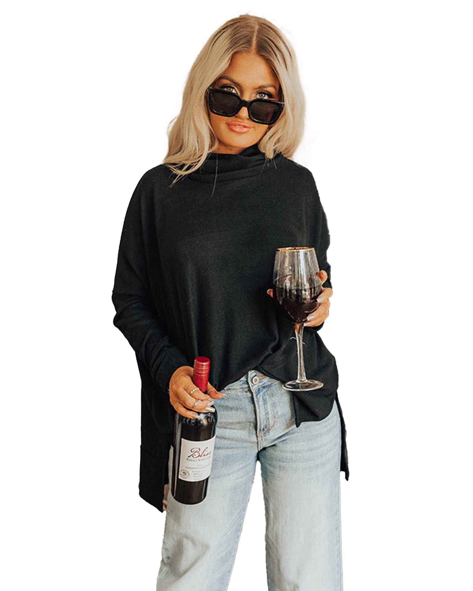 This black cowl neck shift tunic top offers a trendy and comfortable fit with a relaxed silhouette. Designed with a lightweight, soft fabric, it features a stylish cowl neckline, long sleeves, and a thigh-length hem with accent side slits. Available in multiple sizes, it is suitable for various body types and provides a fashionable yet casual look.