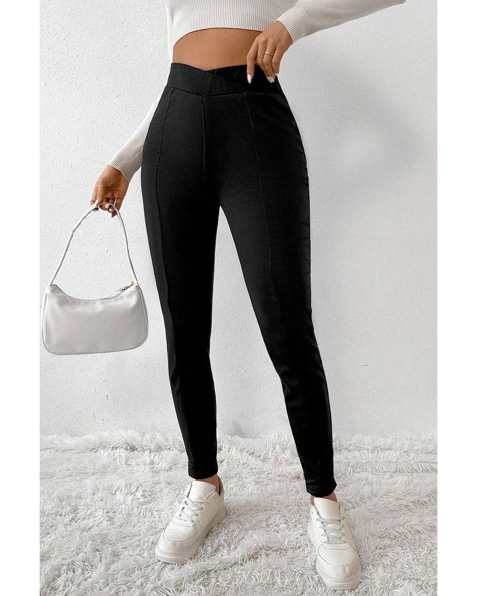 This pair of thermal leggings features a stylish crossed waist design and a high waist for a slimming effect. The vertical seams add a fashionable touch, while the thermal lining provides warmth and comfort. These leggings are suitable for workouts, casual wear, or layering to keep warm during colder days.