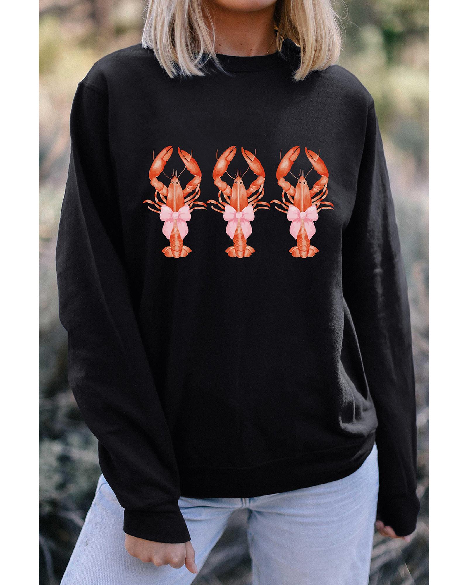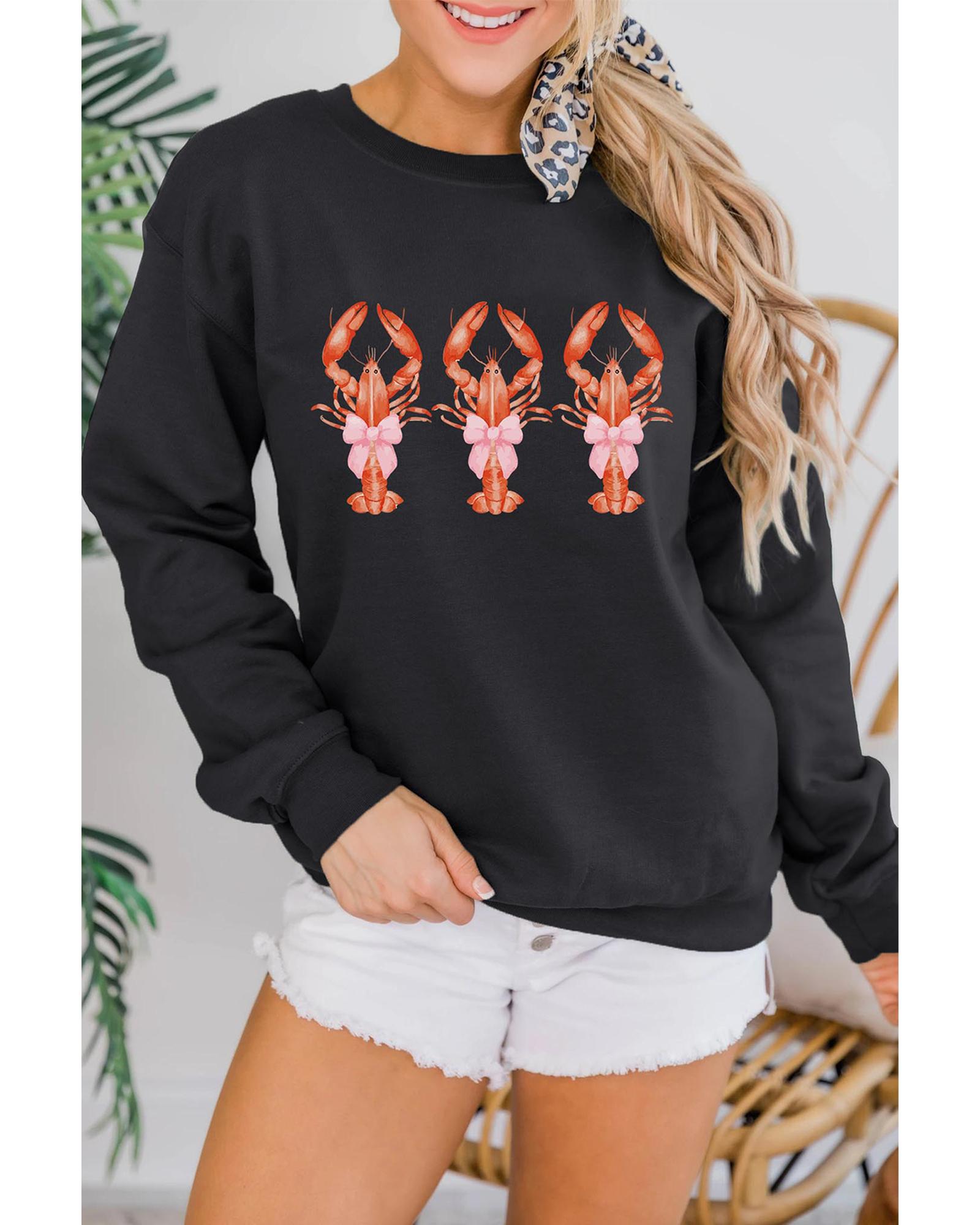 Black Cute Bow Crawfish Printed Drop Shoulder Sweatshirt – S