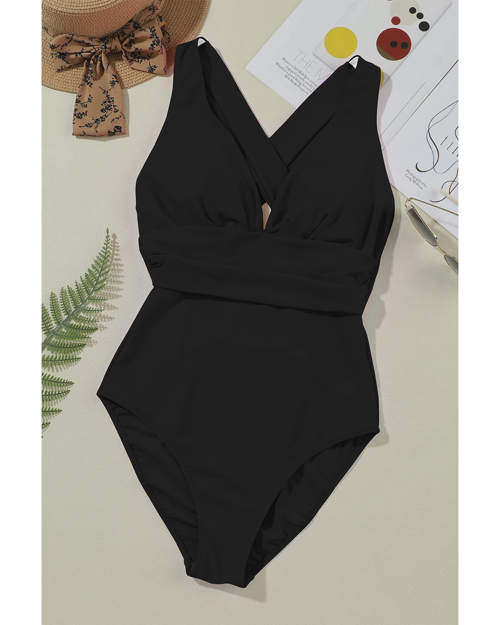 This stylish monokini features a deep V neckline and a crossover backless design, creating a bold and fashionable look. The ruched detailing adds a touch of elegance, while the high cut offers a flattering silhouette. Made with high elasticity material, it ensures a comfortable fit for various body types.