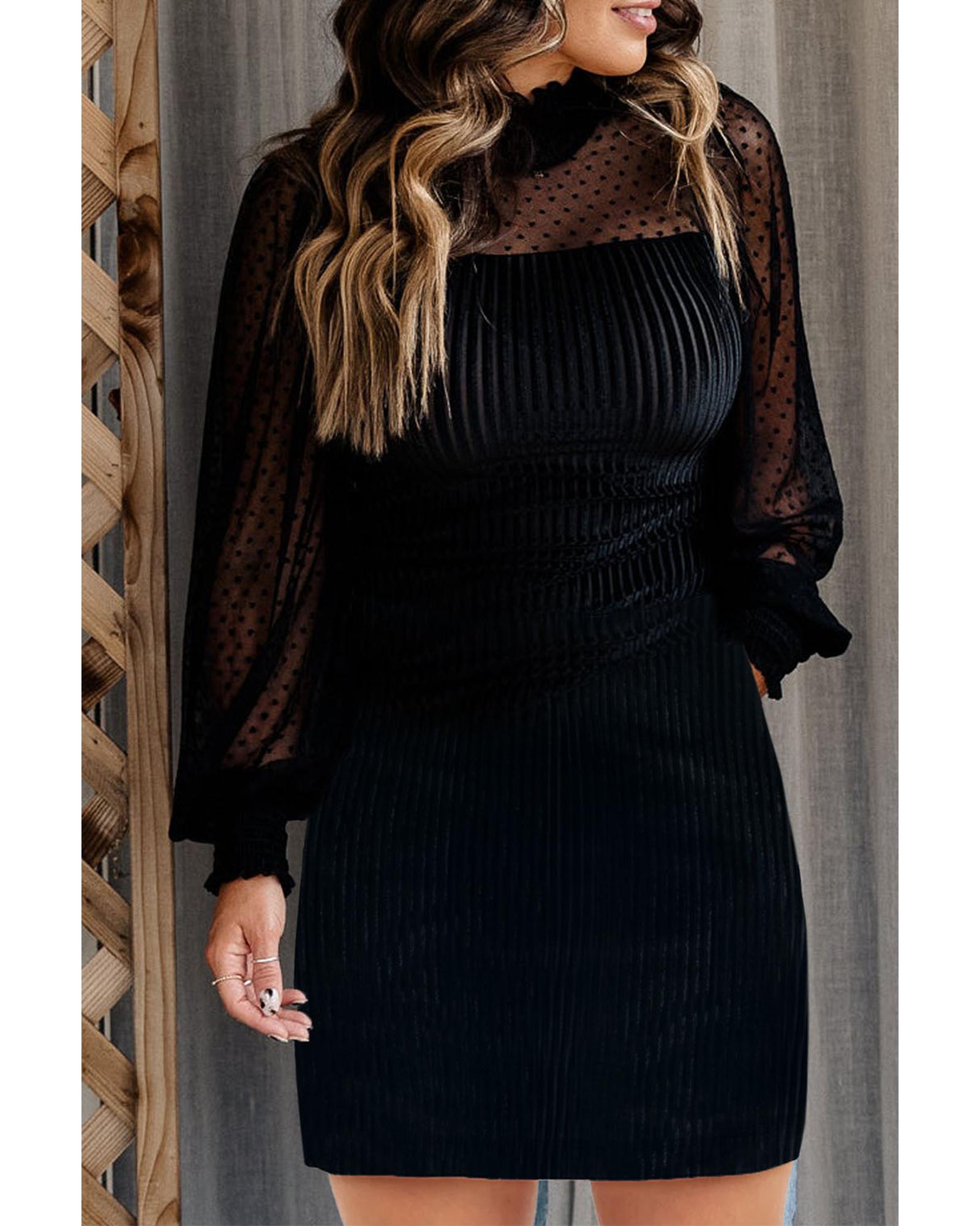 This dress features a unique combination of polka dots and stripes, creating a stylish and eye-catching look. The frilled neckline adds a touch of sophistication, while the bubble sleeves provide a playful element. Made from dotted mesh fabric, it offers an intricate texture and a versatile bodycon silhouette suitable for various occasions and body types.
