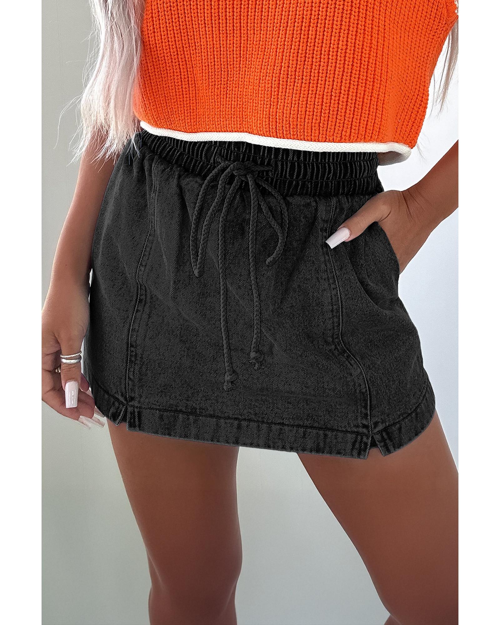 This pair of black denim shorts features a high waist design with a drawstring for adjustable comfort. The shorts are styled to resemble a mini skirt from the front, combining casual fashion with functional details. They are suitable for various casual occasions and offer a comfortable fit with their elastic waistband and side pockets.