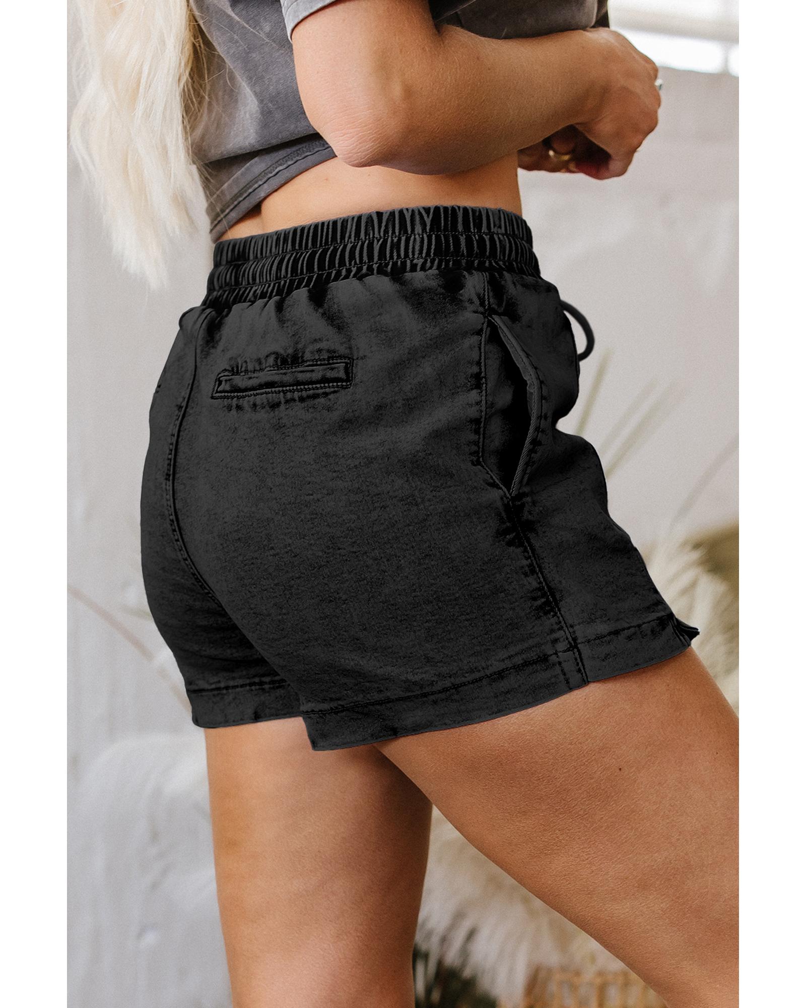 This pair of black denim shorts features a high waist and a drawstring for an adjustable fit. The design includes side pockets and a style that resembles a mini skirt from the front, offering a casual yet fashionable look. Made with high elasticity material, these shorts provide comfort and flexibility for everyday wear.