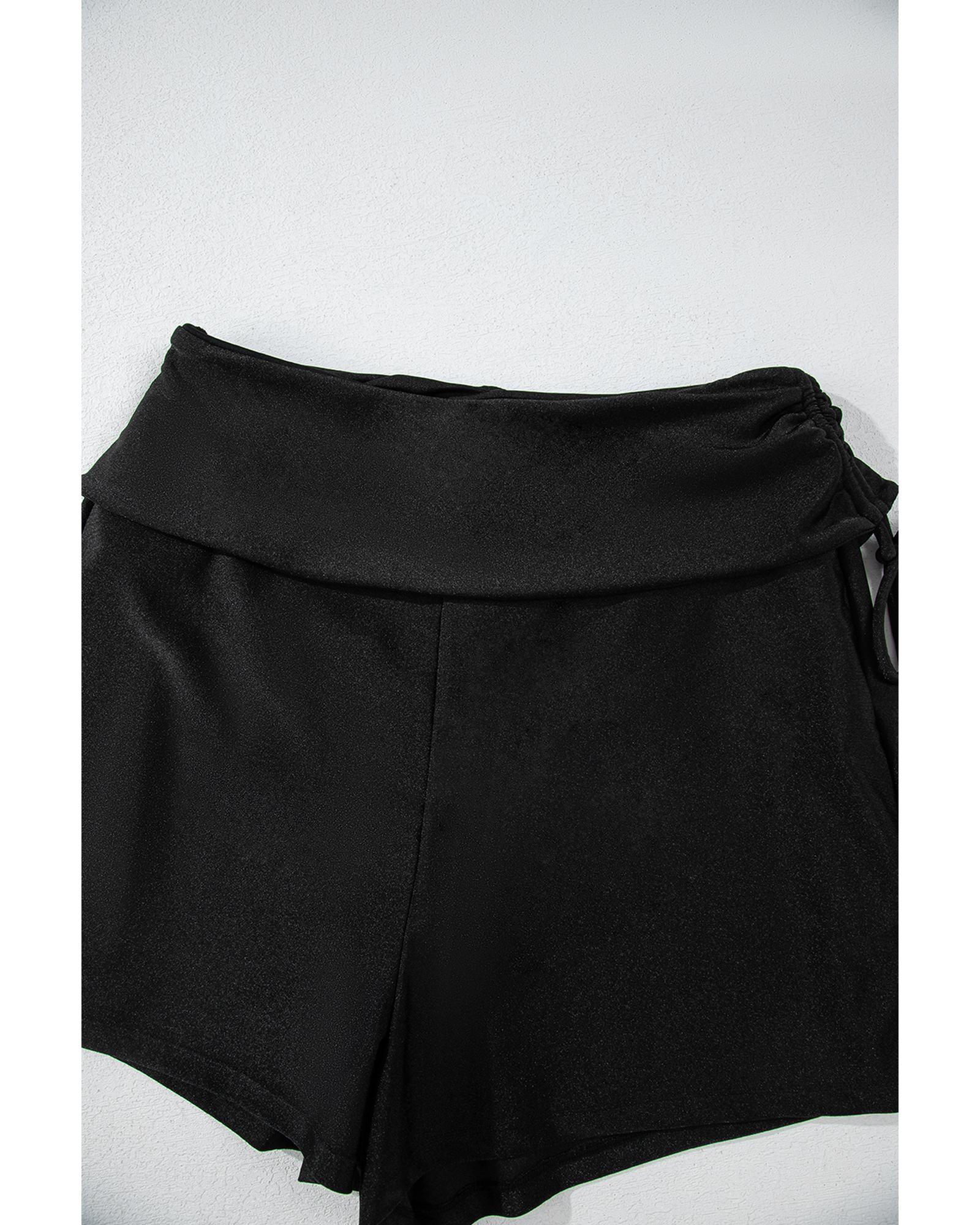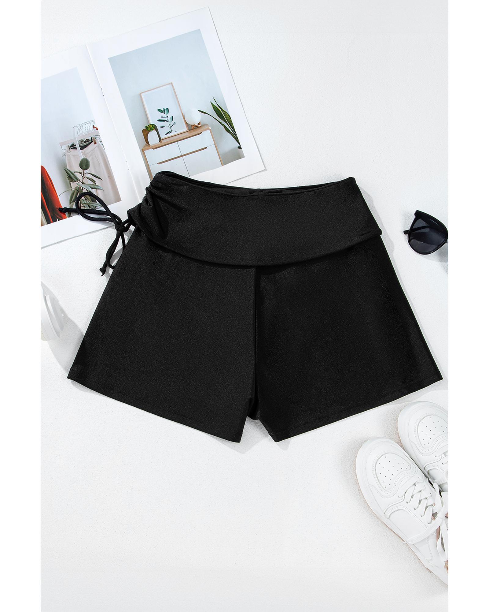 This pair of swim shorts features a stylish ruched design with a high waist and a loose fit, offering both comfort and a flattering silhouette. The drawstring waist allows for a customizable and secure fit, making these shorts suitable for various body types and activities.