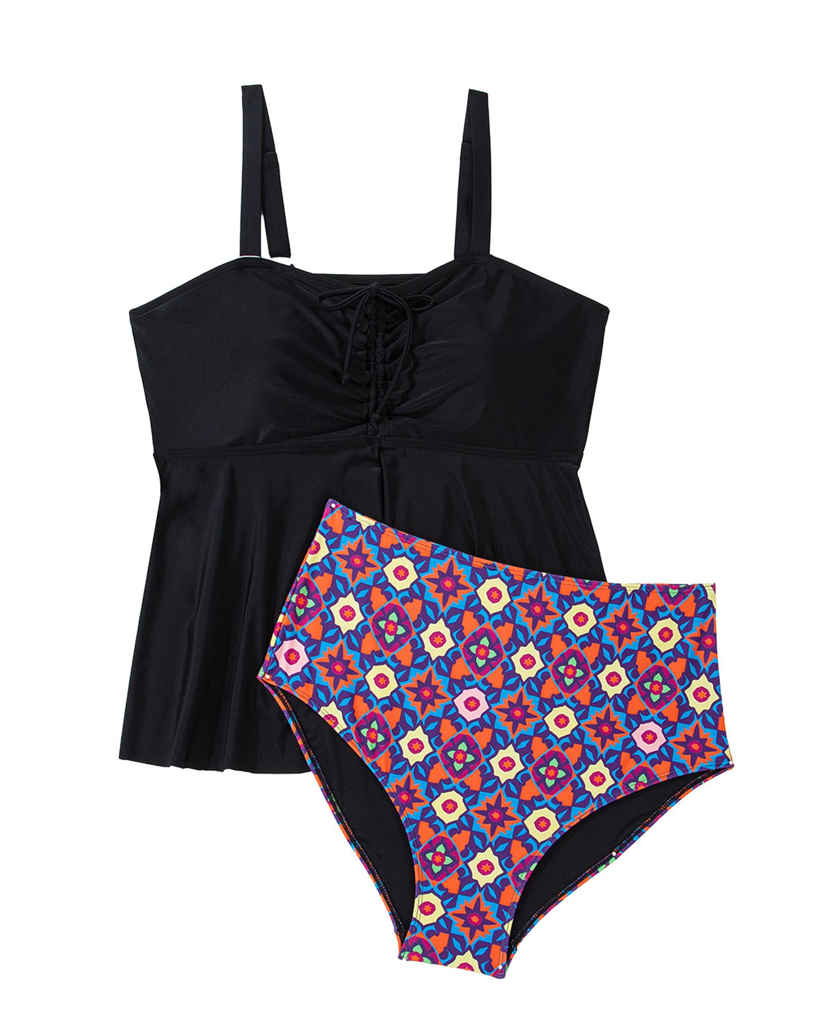 Black Drawstring Tied Front Flared Top Geometric Print Bottom Plus Size Tankinis – 1X