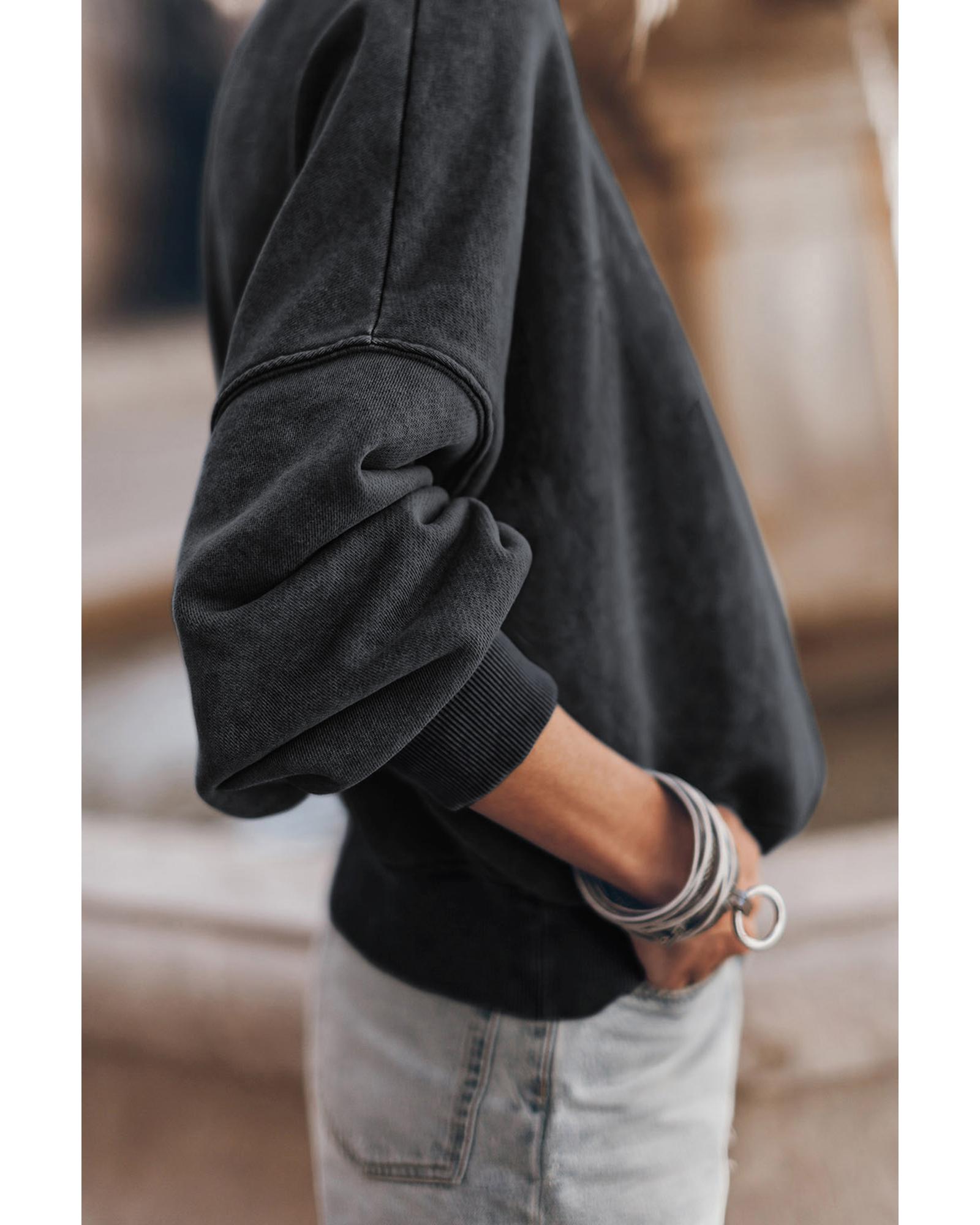 This black drop shoulder crew neck pullover sweatshirt offers a casual and vintage style with a relaxed washed hue silhouette. Its fashionable drop shoulder design makes it a versatile piece suitable for various outfits and occasions, fitting different ages and body shapes.