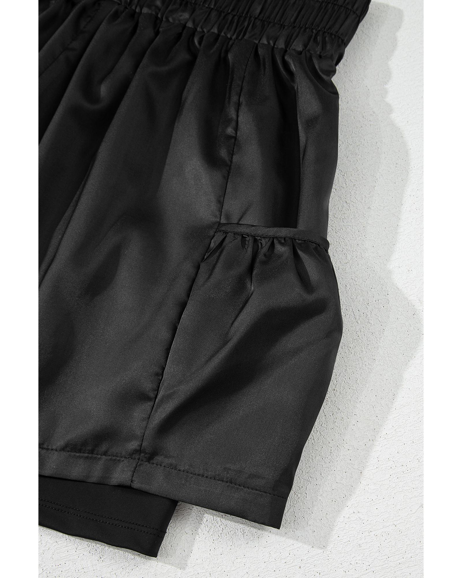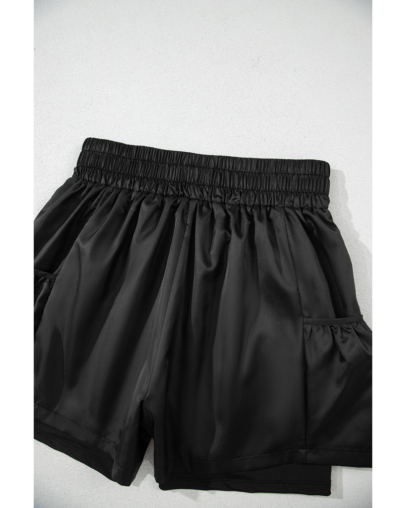 These black elastic high waist casual shorts are designed for comfort and practicality. They feature a wide waistband that provides a flattering fit and an elastic waist for added flexibility. The shorts include side pockets, making them convenient for everyday wear and easy to style with various outfits.