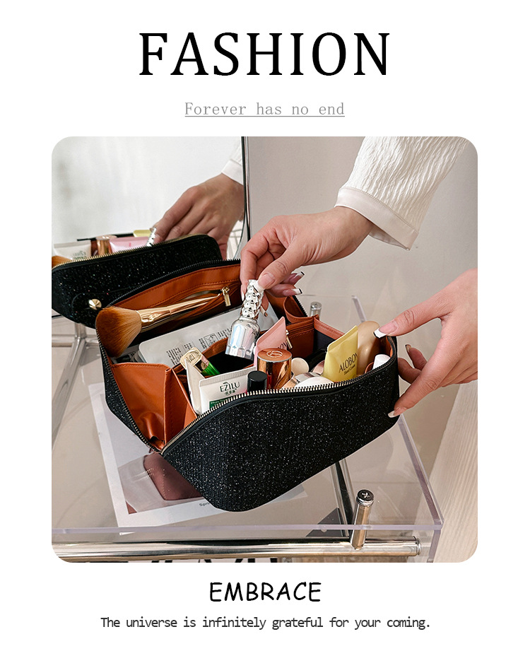 This elegant glitter cosmetic bag features a stylish design with a zipper closure and a convenient handle. Made from durable glitter fabric, it combines a chic appearance with practicality, making it suitable for daily use and travel. Its compact size offers ample space for storing essential cosmetics and toiletries while remaining easy to carry and organize.