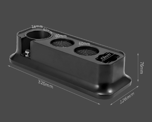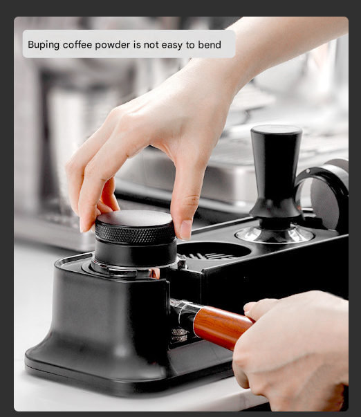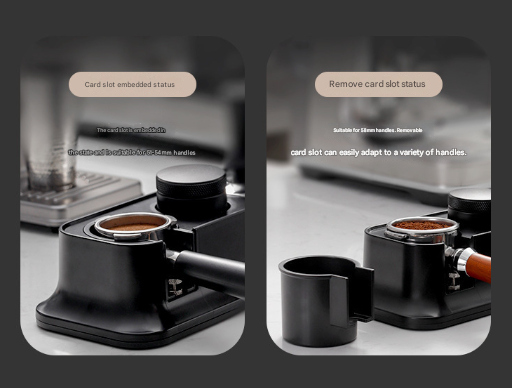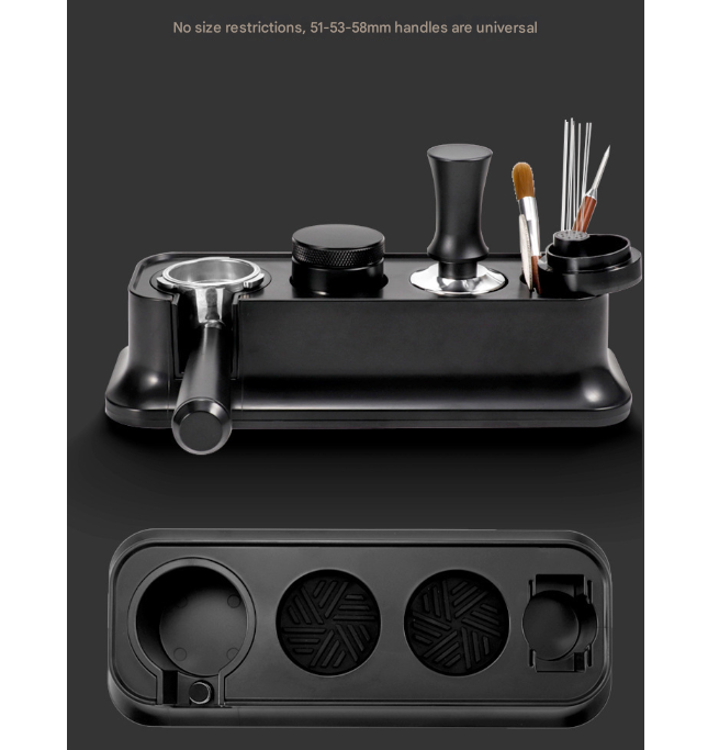 This espresso tamping station is designed to organize and streamline your coffee preparation process. It provides dedicated spaces for your portafilter, tamper, and distributor, helping to keep your workspace tidy and efficient.