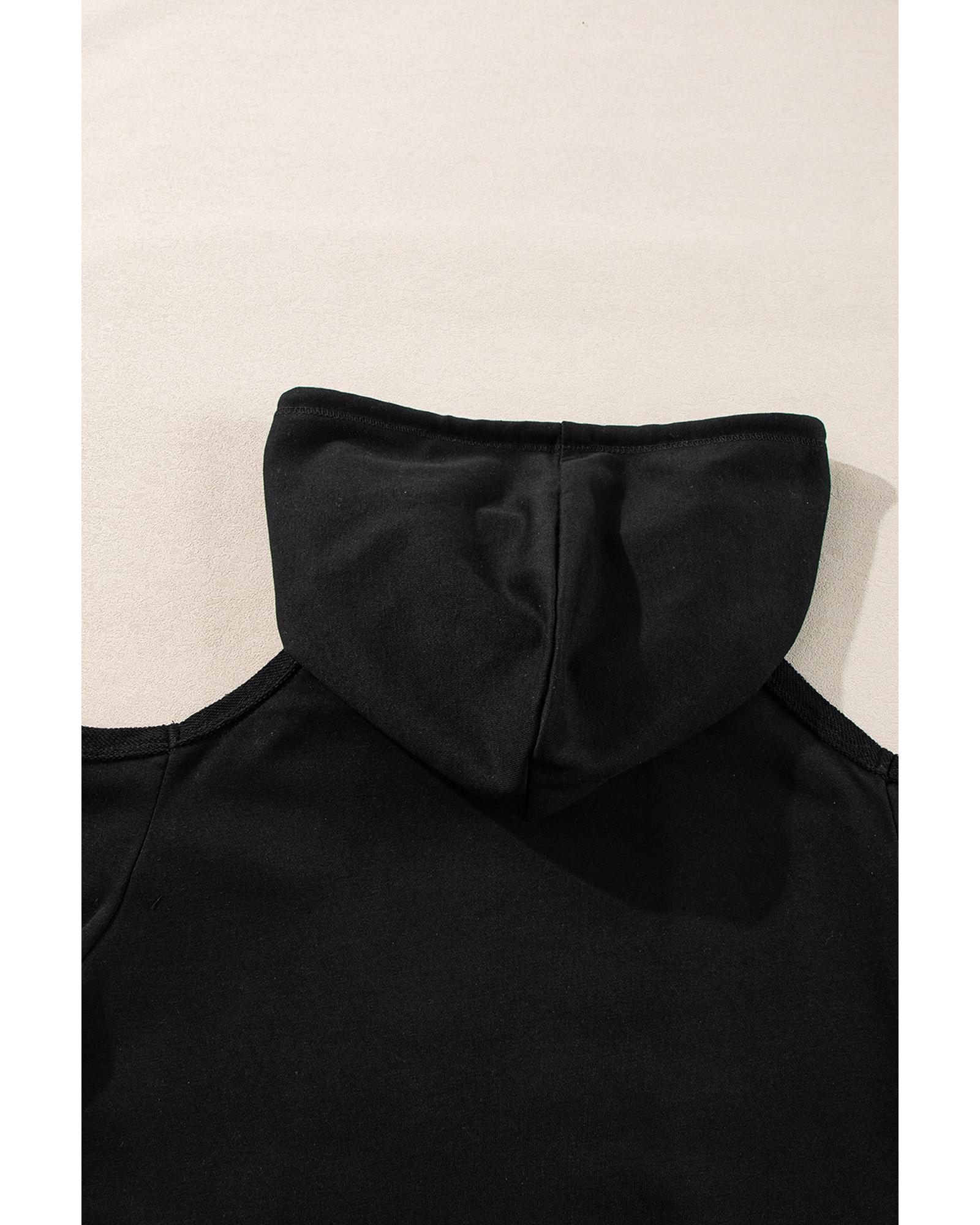 Black Exposed Seam Cold Shoulder Drawstring Hoodie – L