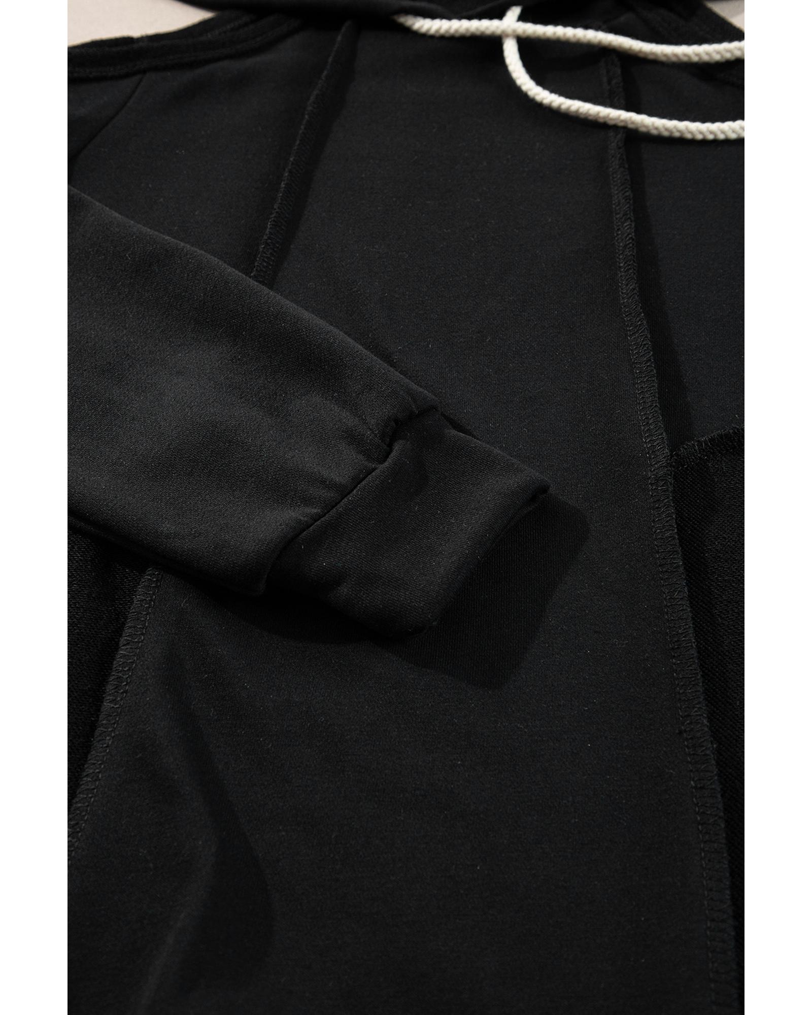 This black exposed seam cold shoulder drawstring hoodie combines trendy design with comfortable wear. Its fitted style and exposed seam details make it a fashionable choice for casual outfits. The hoodie features an adjustable drawstring hood and is easy to pair with jeans or denim shorts for a stylish look.