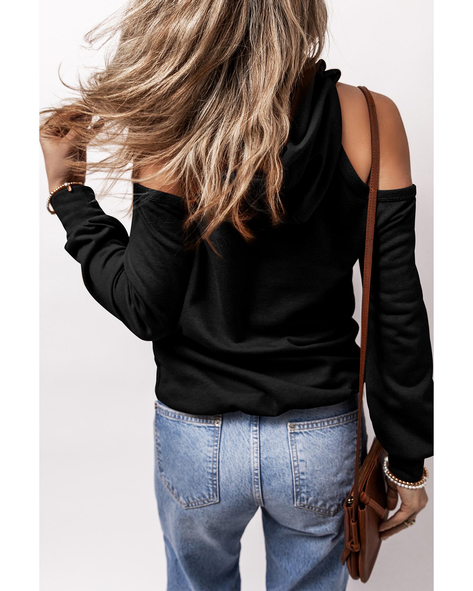This stylish cold shoulder hoodie features an exposed seam design and a drawstring hood for adjustable comfort. It offers a trendy fitted look that pairs effortlessly with jeans or denim shorts, making it a versatile addition to your casual wardrobe.