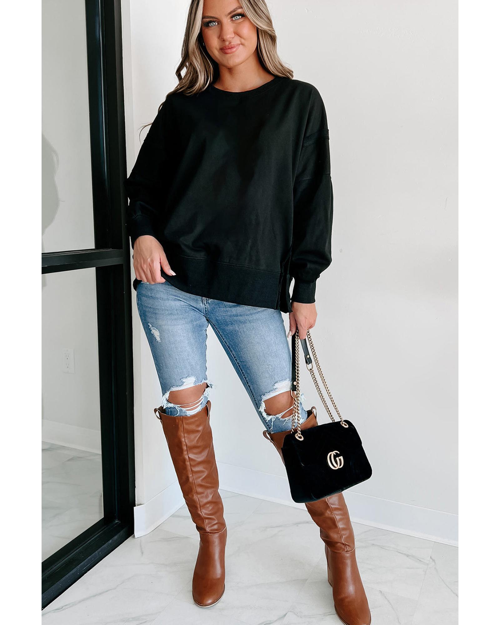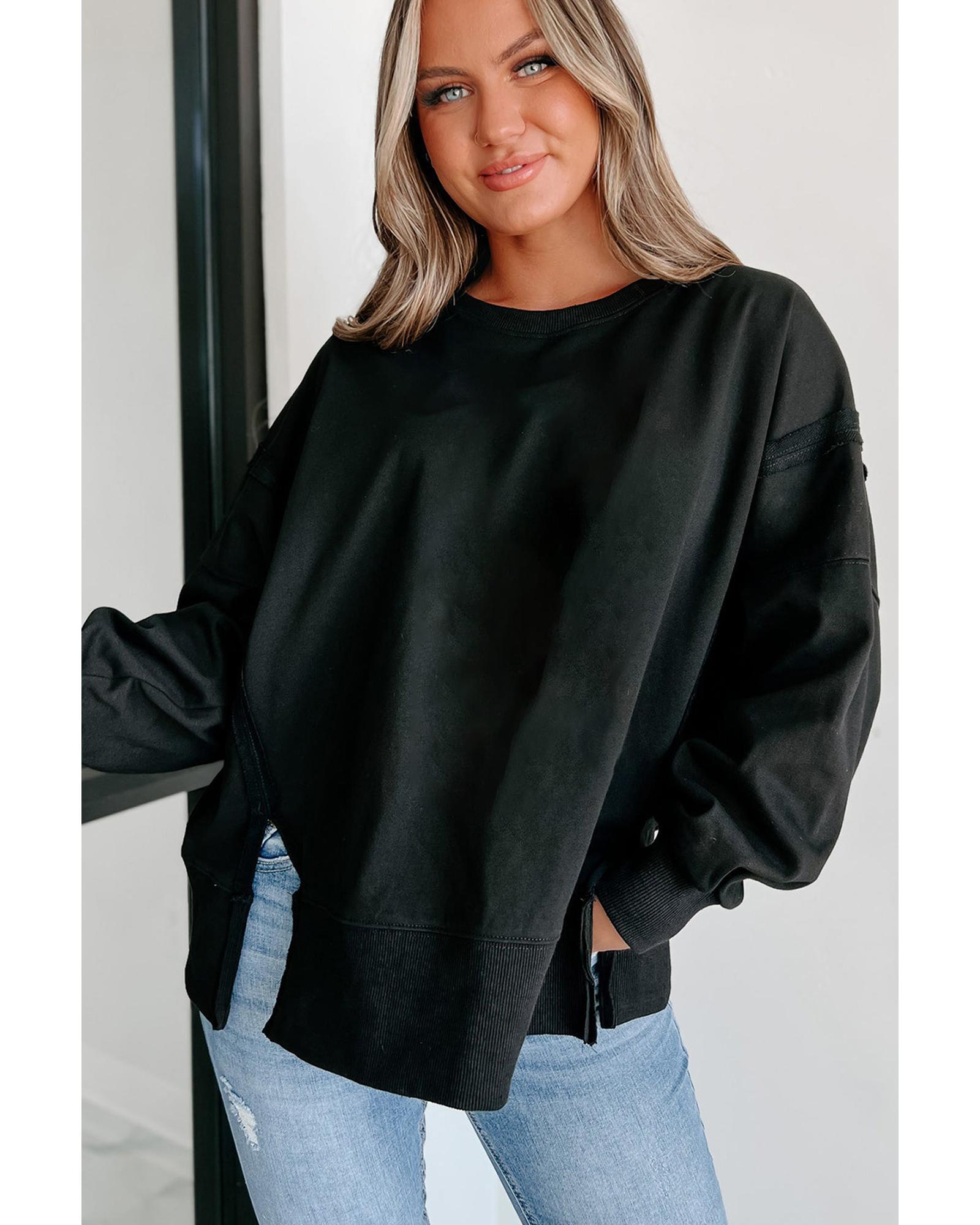 Black Exposed Seam Drop Shoulder Round Neck Sweatshirt with Slits – L