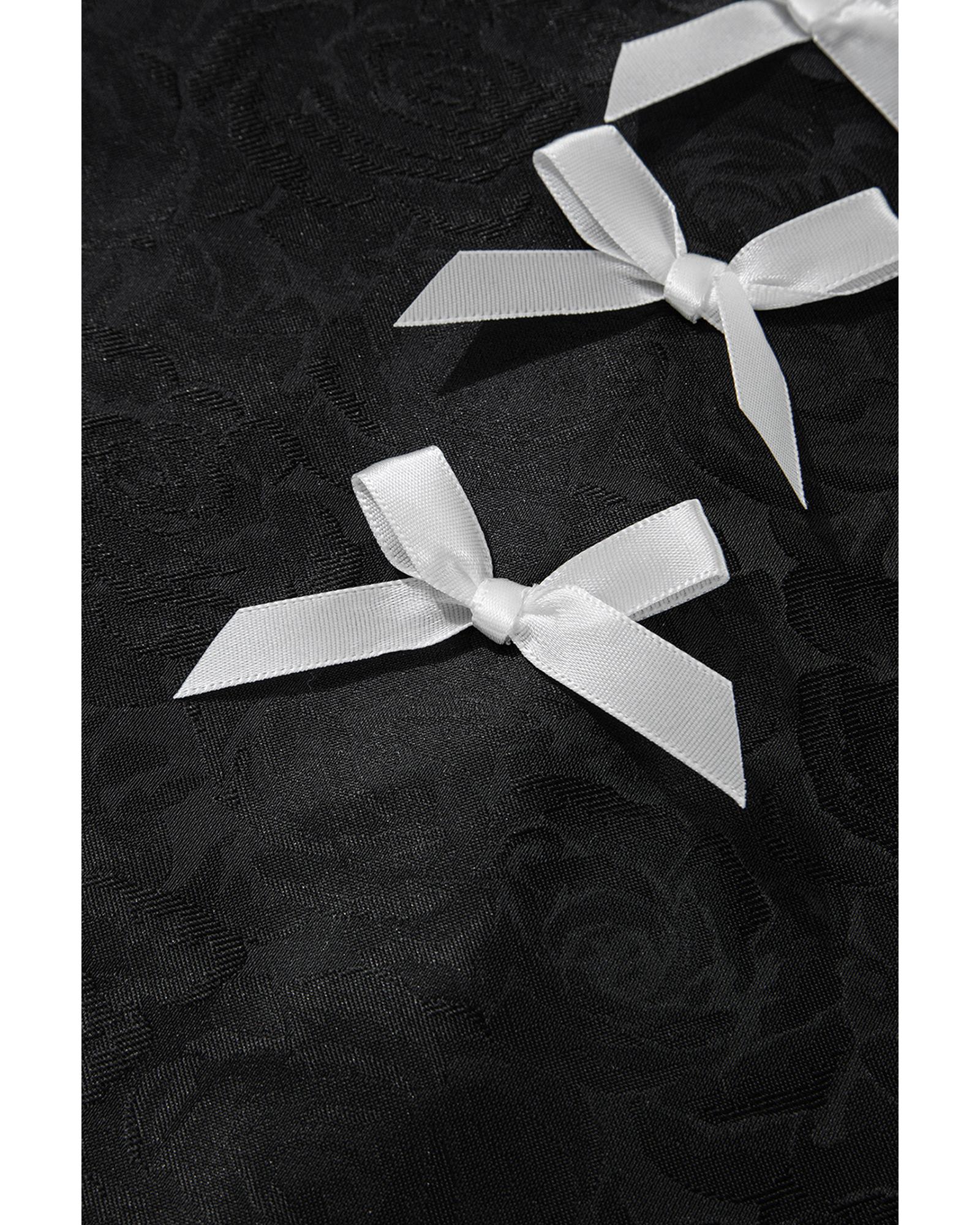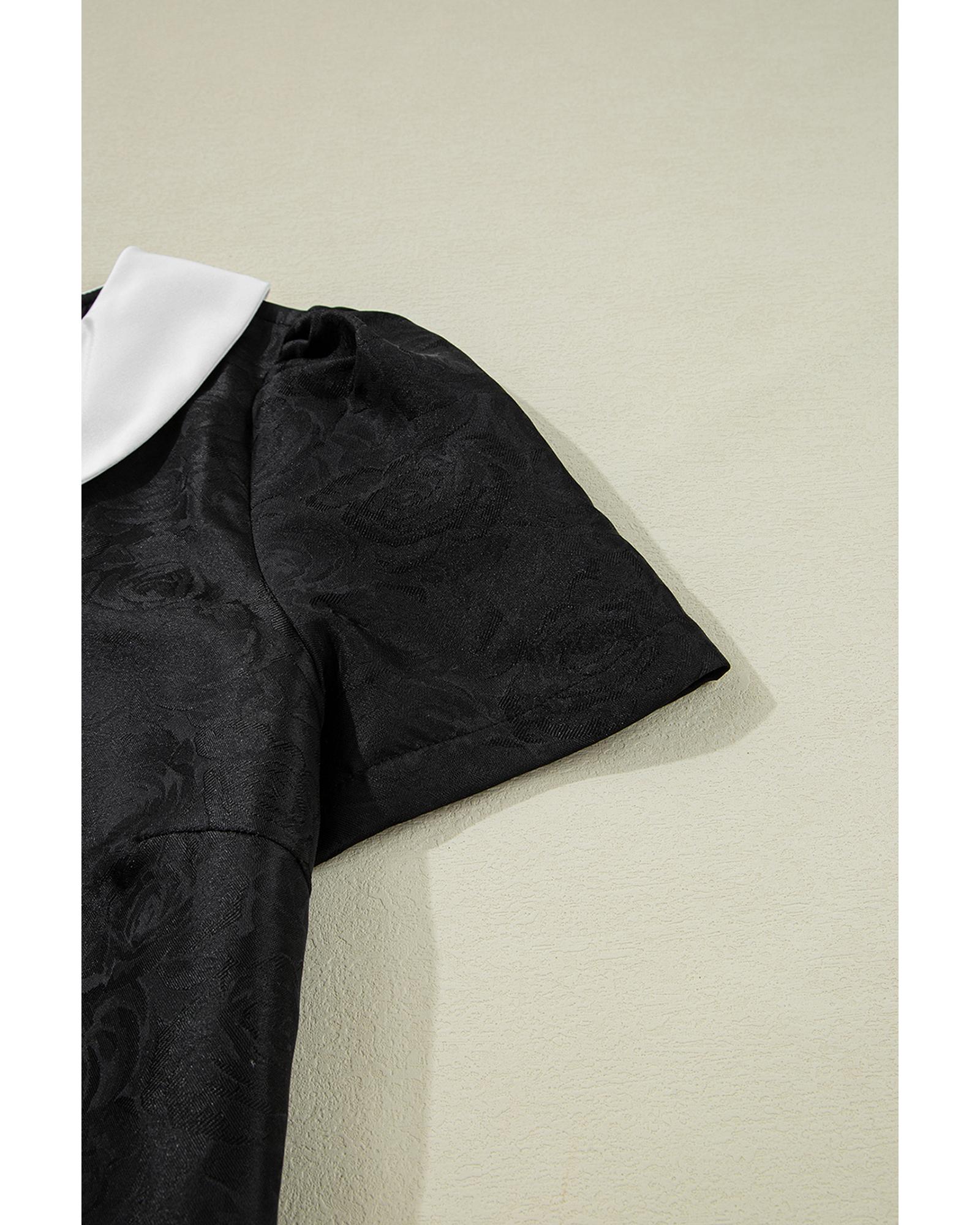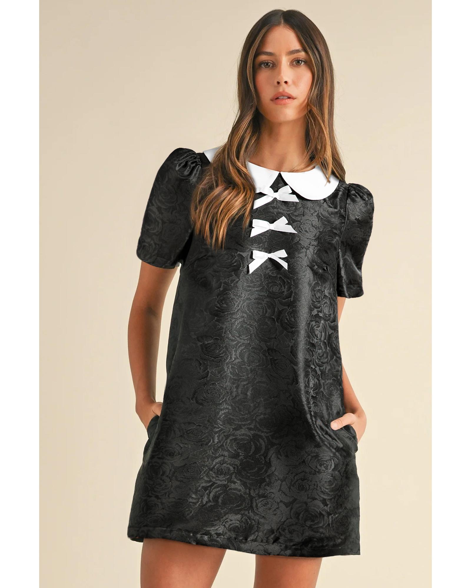 This black mini dress features a floral jacquard pattern with contrasting details, offering a stylish and feminine look. It is designed with short puff sleeves, a classic Peter Pan collar, and a charming bow accent, making it suitable for various occasions. The mini length adds a trendy touch to the overall design.