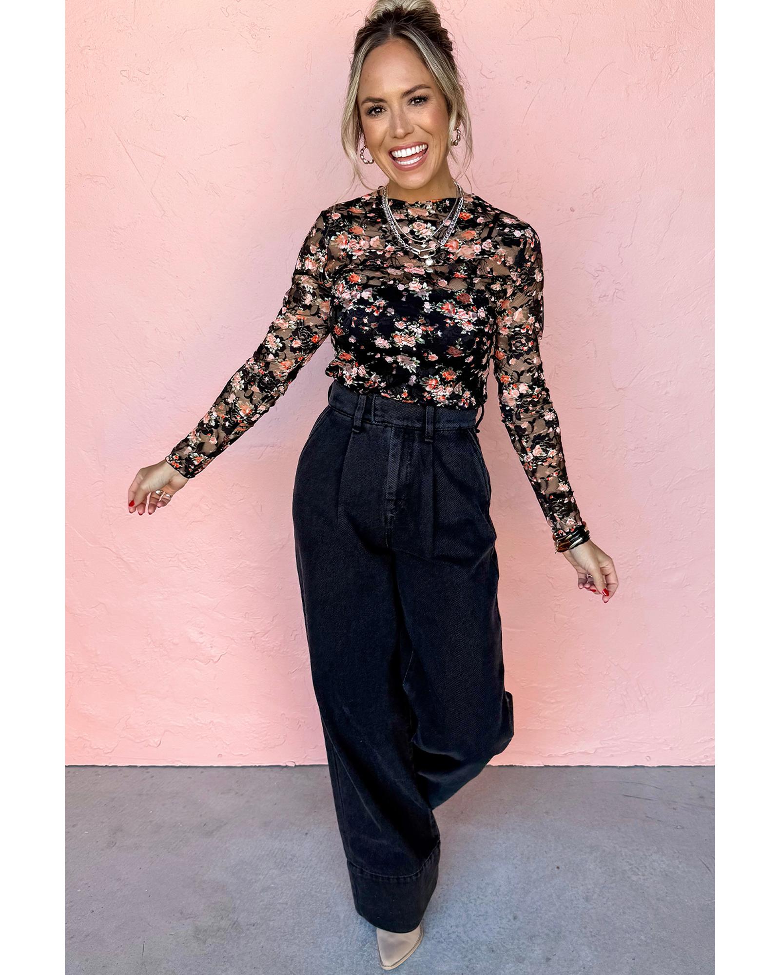 This black floral mesh sheer long sleeve top combines a trendy fitted design with a captivating floral pattern. Made from a sheer mesh fabric, it offers a flirty and stylish look suitable for various occasions. The top features a flattering fit with lettuce edge trim and medium elasticity for comfort. It is designed to enhance your everyday style or be perfect for date nights.