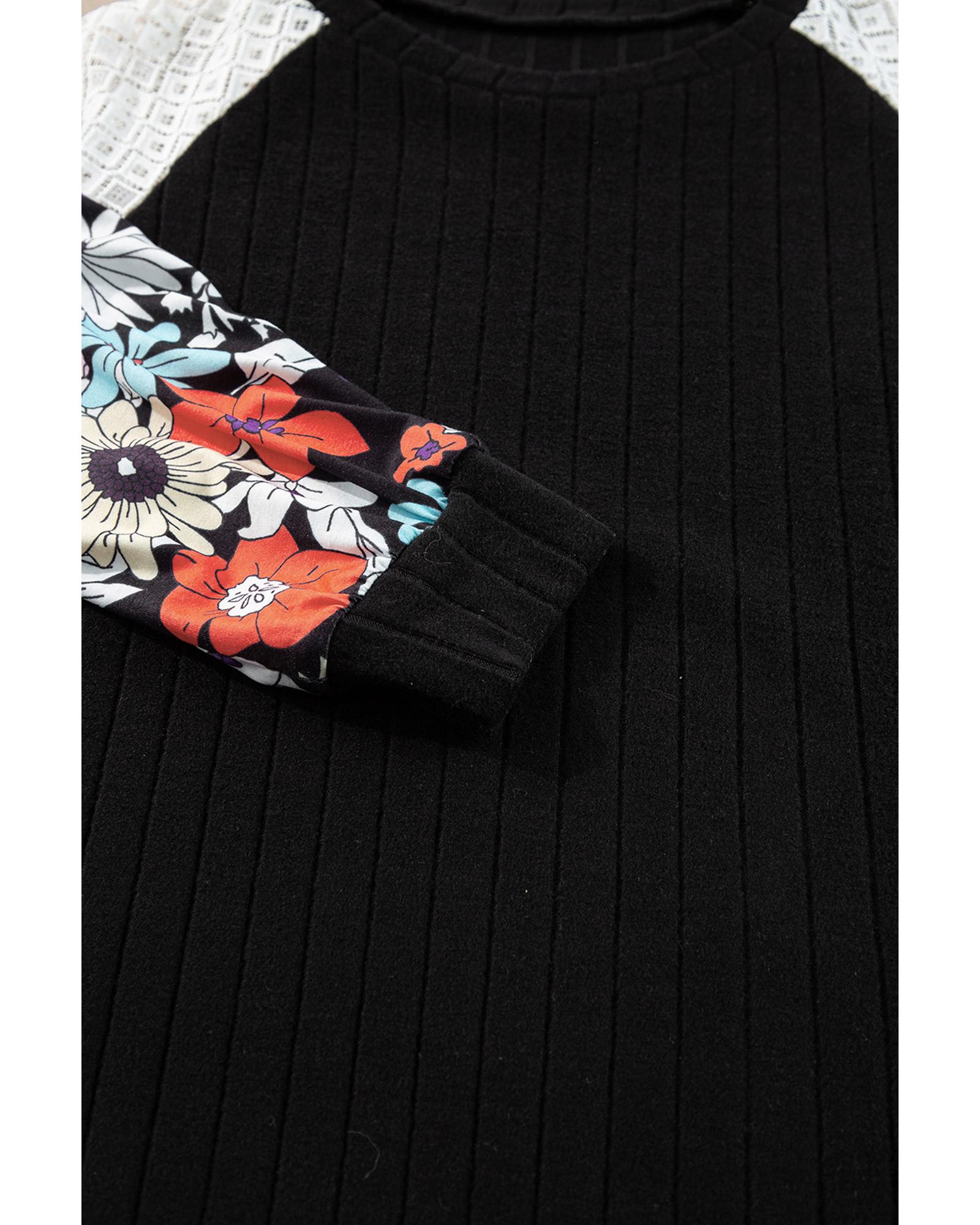 Black Floral Patchwork Long Sleeve Ribbed Blouse – M