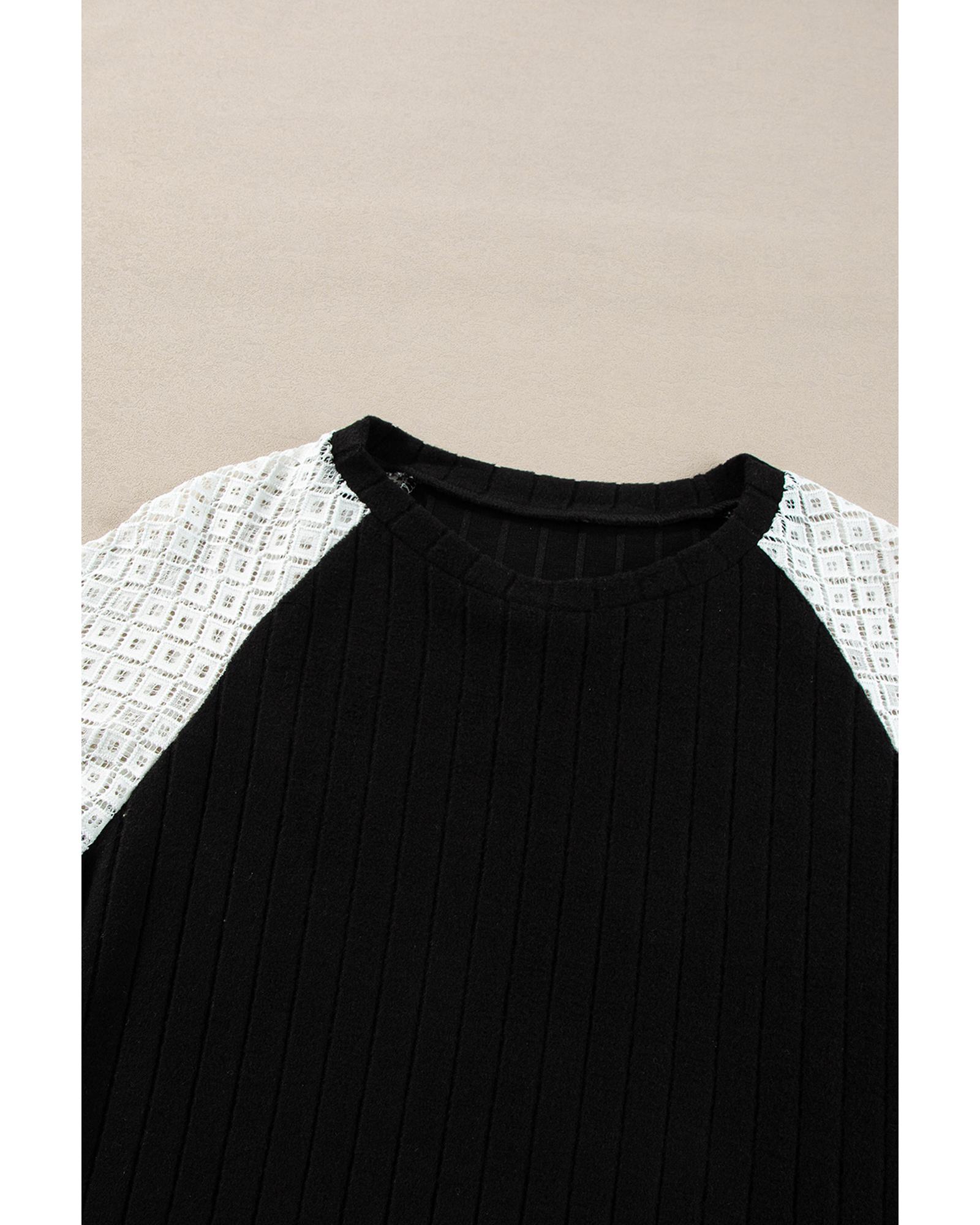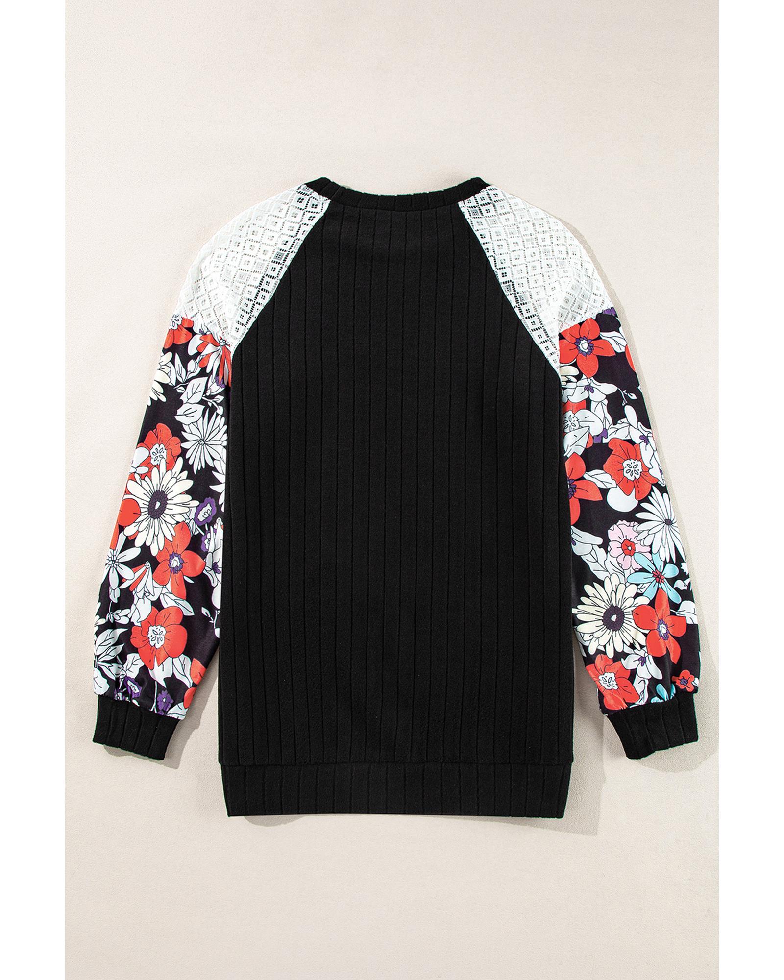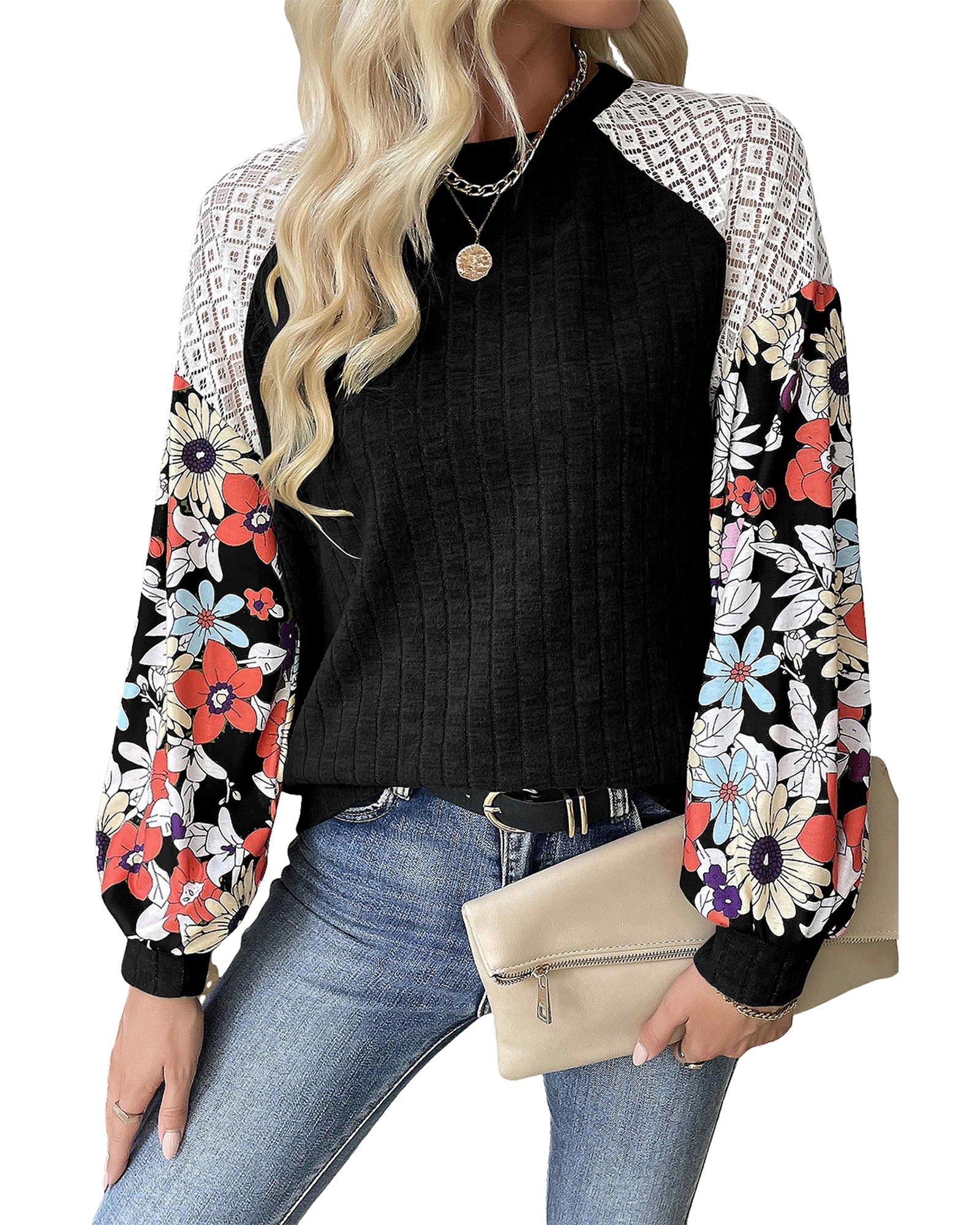 This long sleeve ribbed blouse features a stylish floral patchwork design, combining elegance with a trendy fitted silhouette. Made from soft, textured knit fabric, it offers both comfort and a feminine appearance suitable for various occasions.