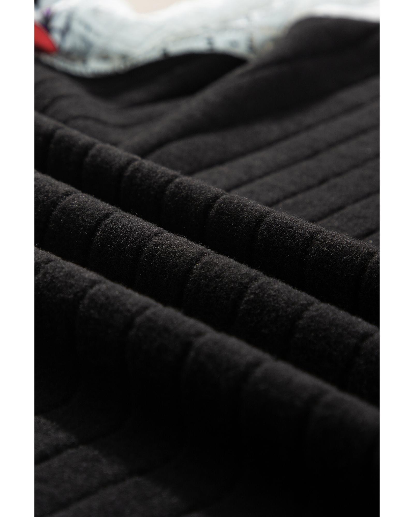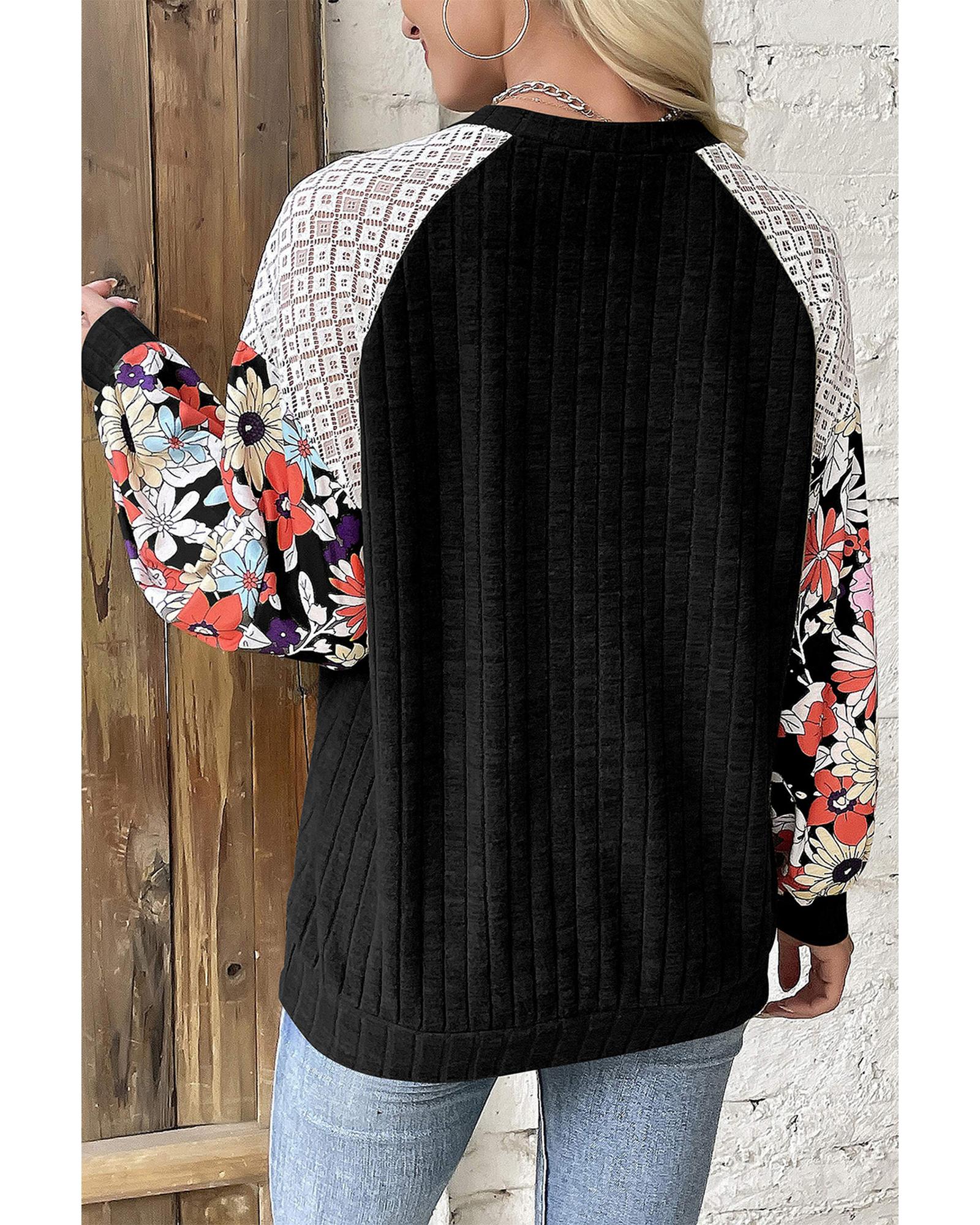 Black Floral Patchwork Long Sleeve Ribbed Blouse – S