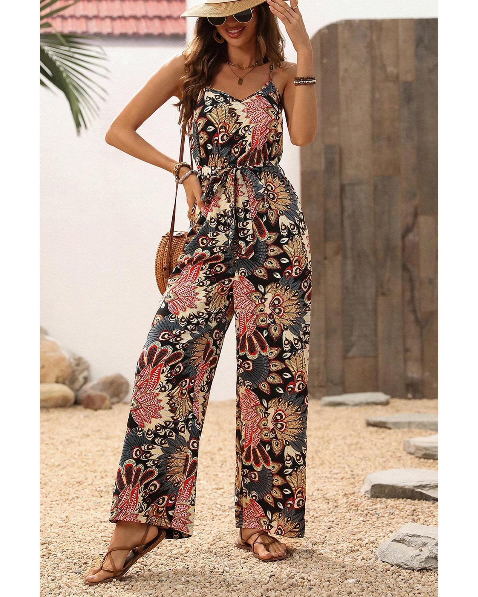 This stylish sleeveless jumpsuit features a floral print design with a comfortable wide-leg cut. It is designed with spaghetti straps and includes a belt to accentuate the waist, making it a versatile choice for various occasions.