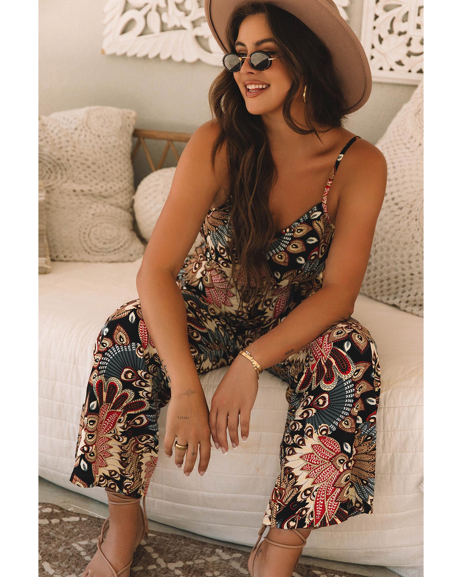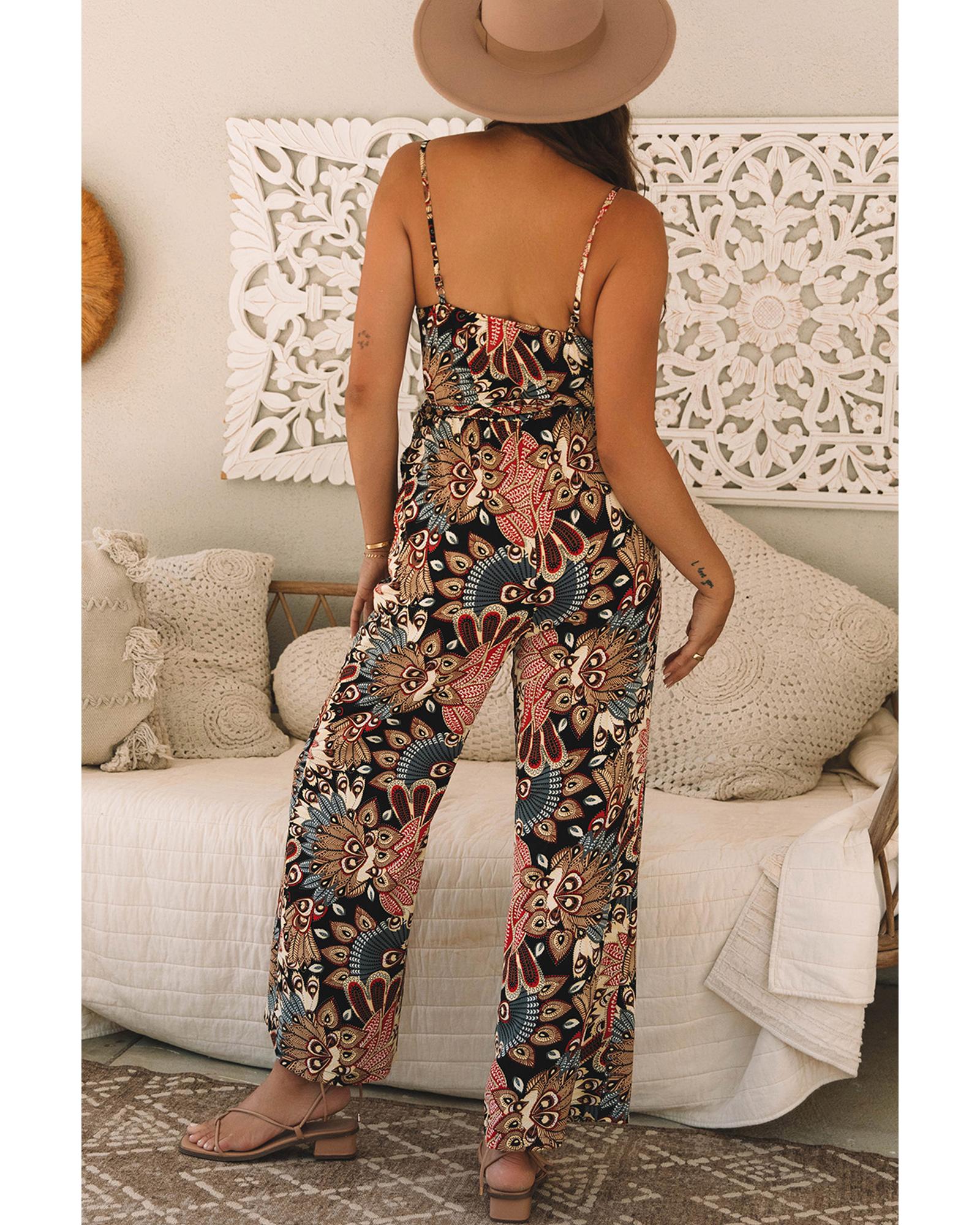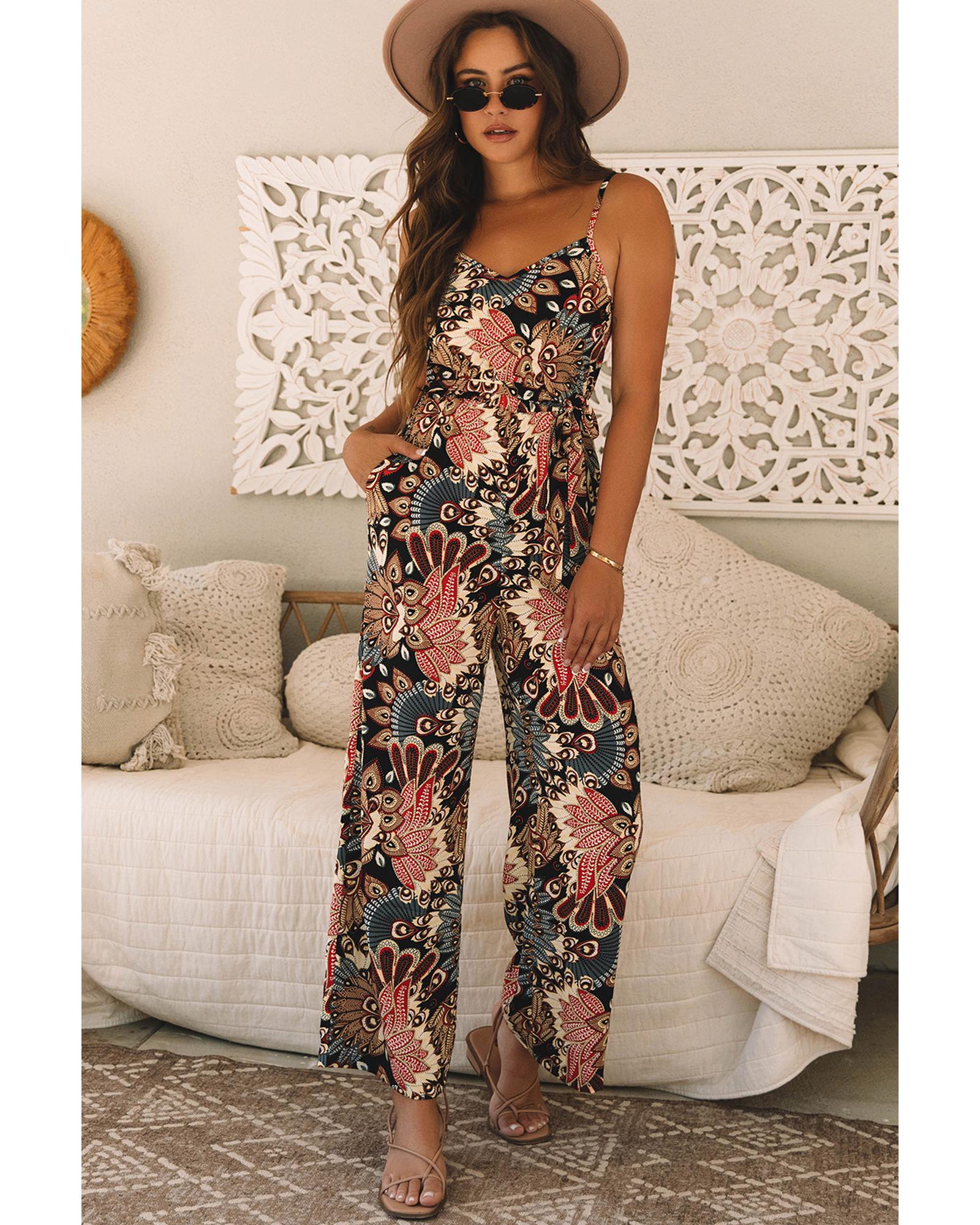 This black floral print sleeveless jumpsuit features a belted waist and wide-leg design, offering a stylish and comfortable fit. Perfect for various occasions, it combines elegance with ease of movement.