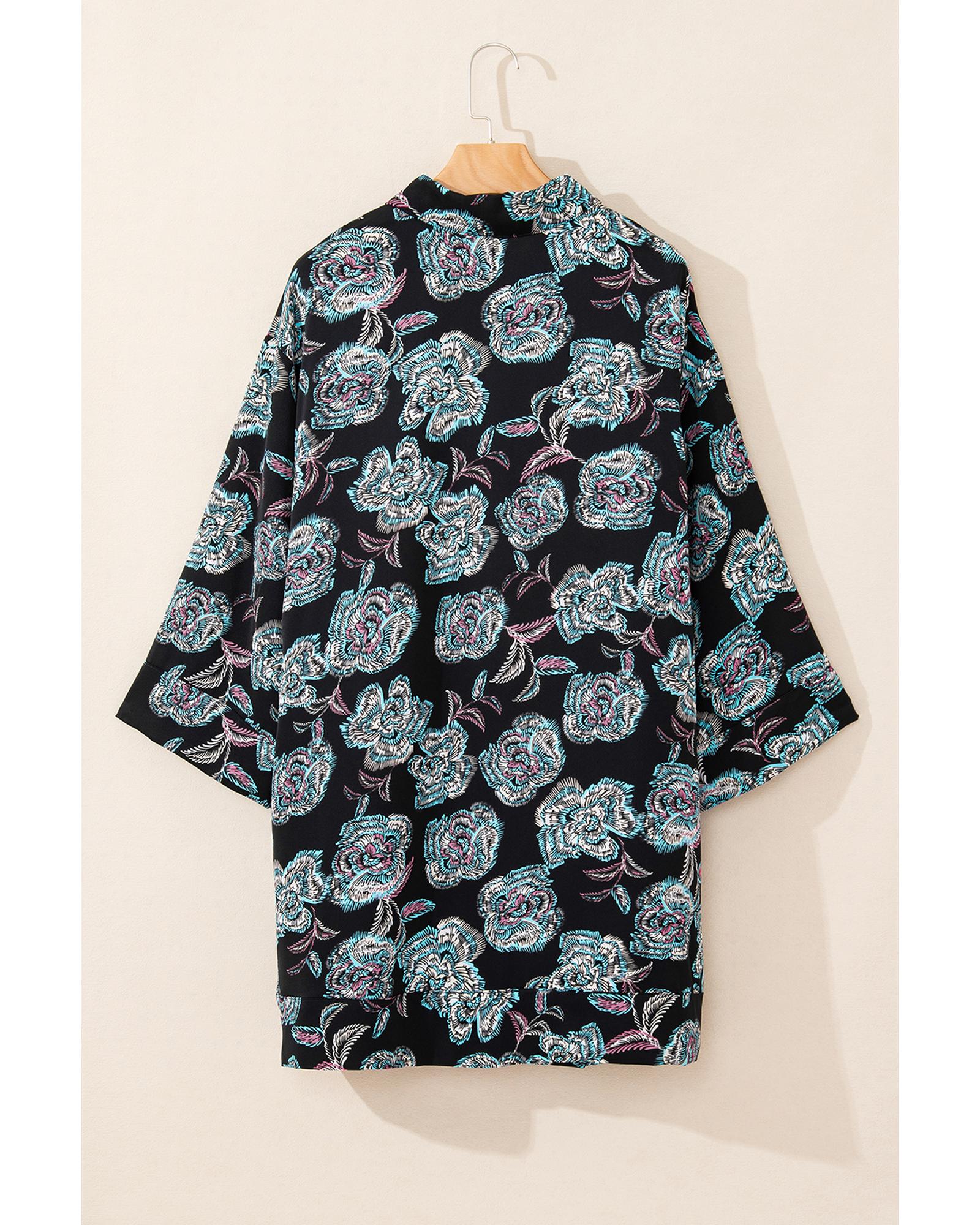Black Floral Print Lapel Collar Loose Shirt Mini Dress – XL