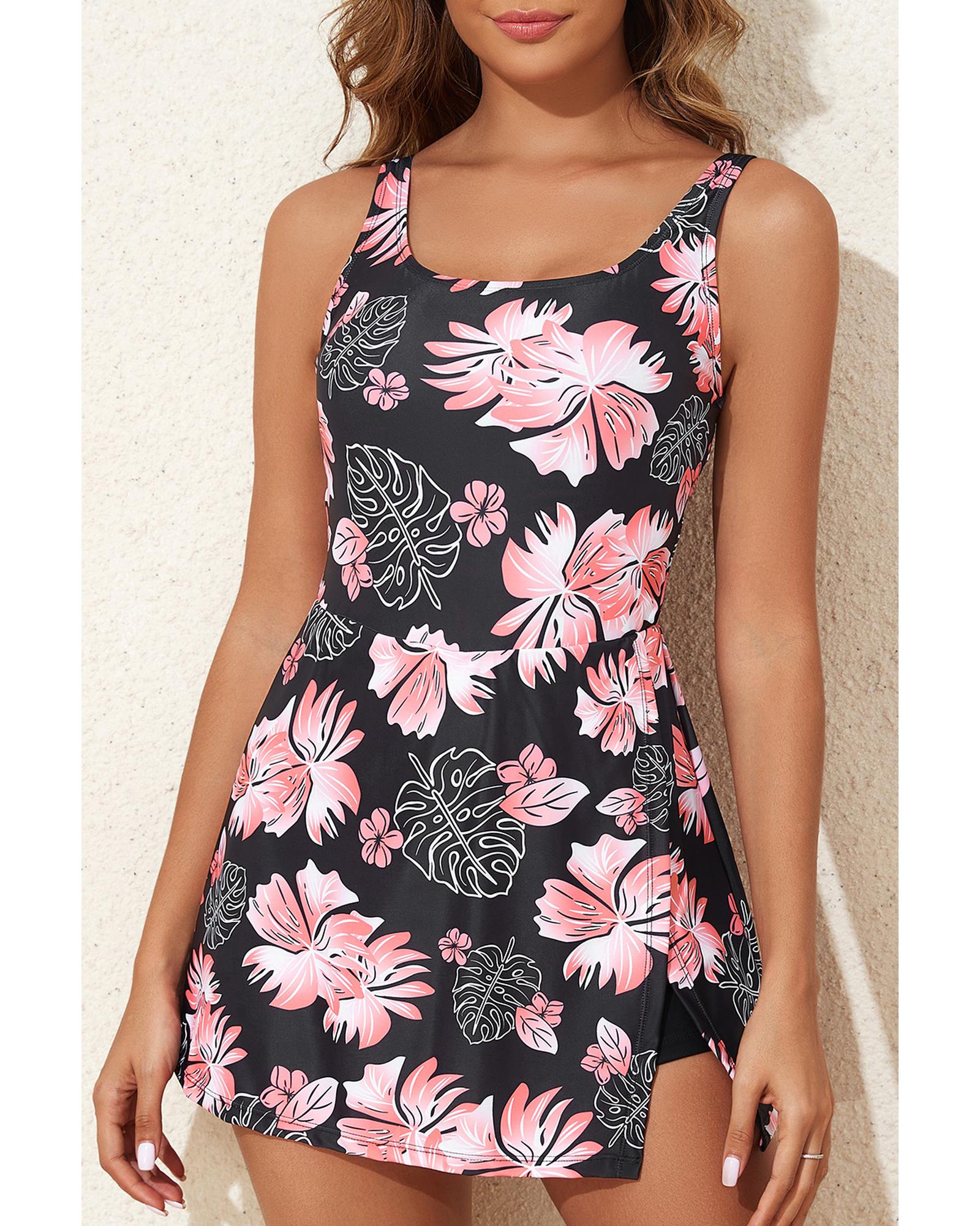 This black floral print twisted hollowed back swim dress combines vibrant design with trendy details, making it an ideal choice for beach or pool parties. Its eye-catching floral pattern and stylish twisted back design create a fashionable and alluring look. The dress features a sultry side slit, adding to its appeal and comfort.