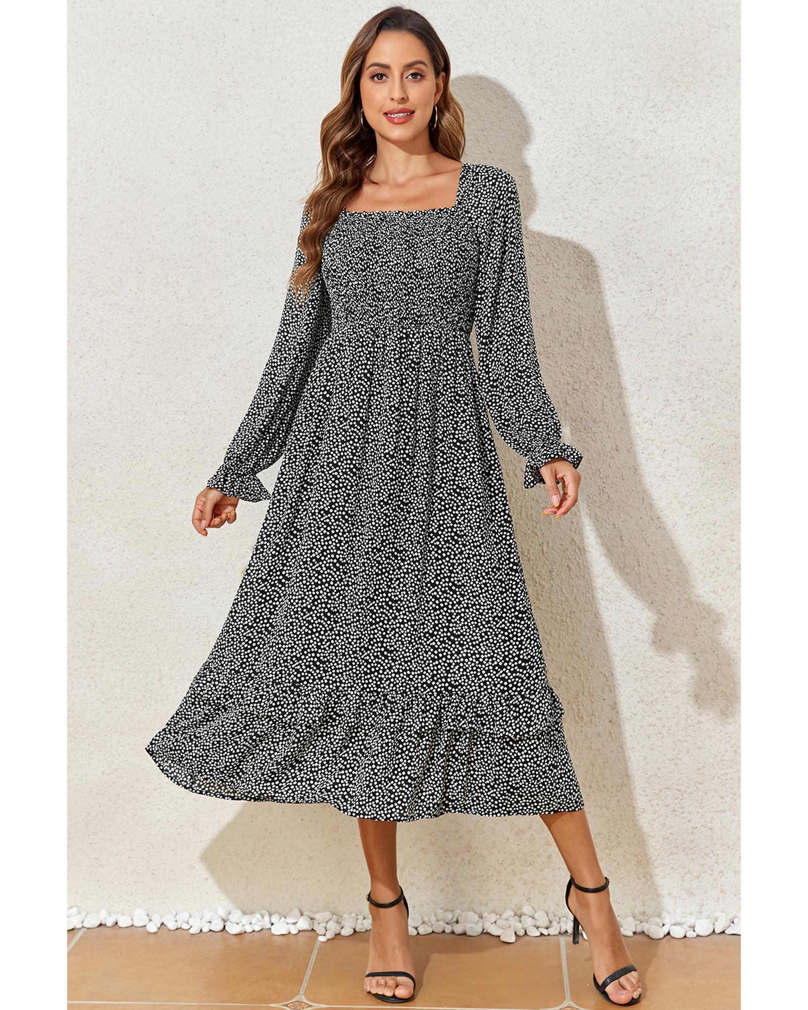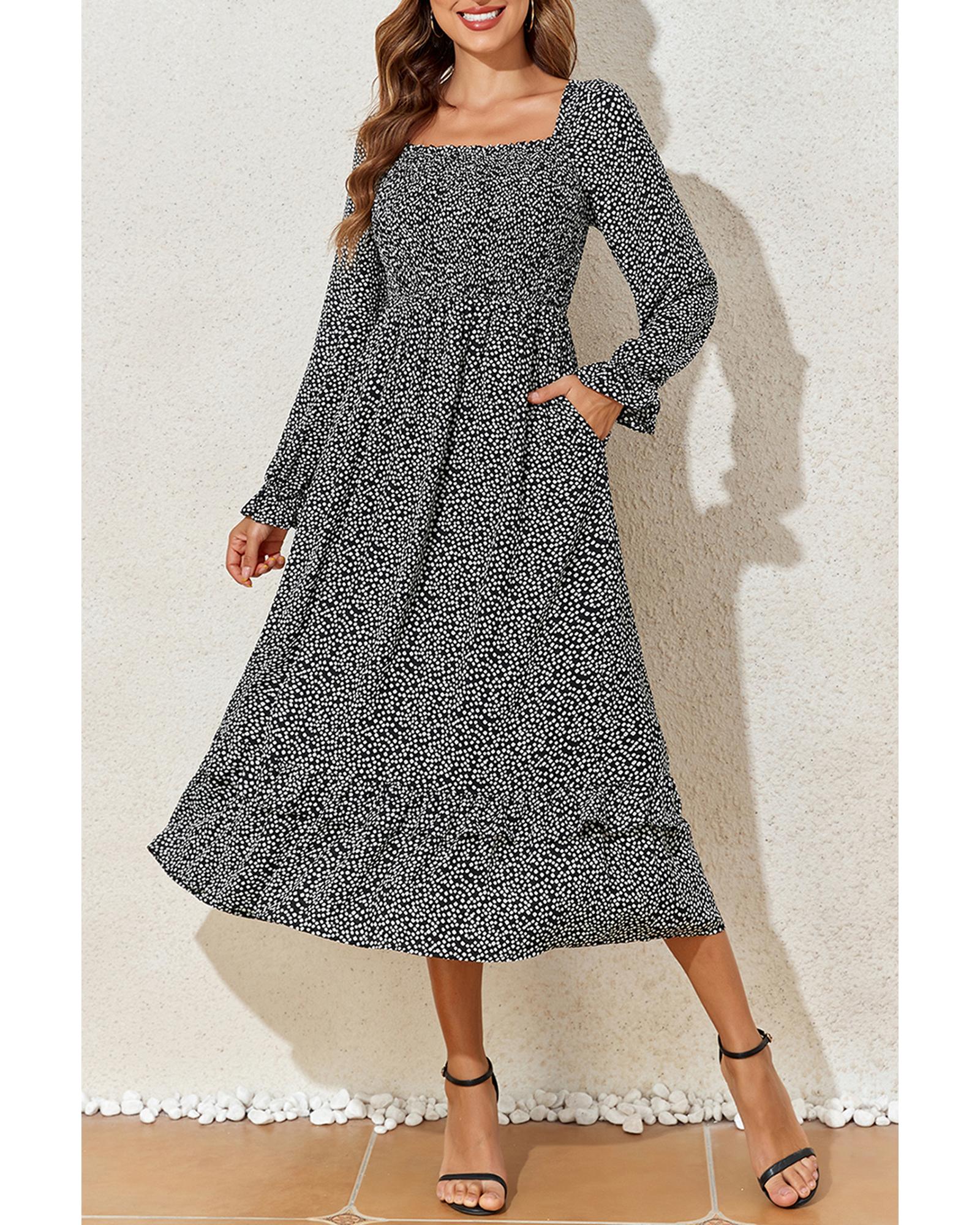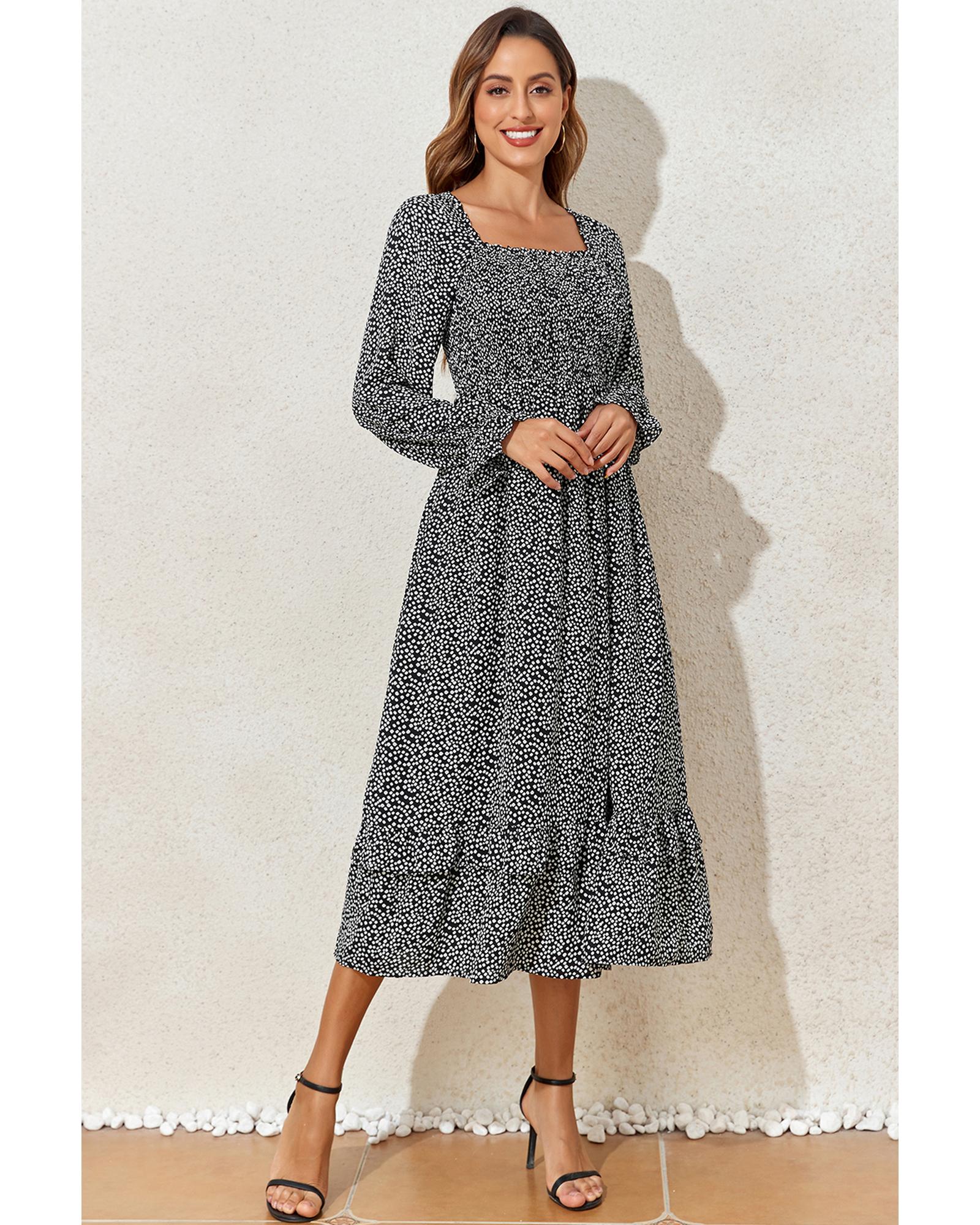 This black floral printed long sleeve midi dress features a stylish square neckline and a playful floral pattern, making it suitable for both daytime and evening occasions. Its midi length offers a sophisticated silhouette, perfect for casual to formal events.