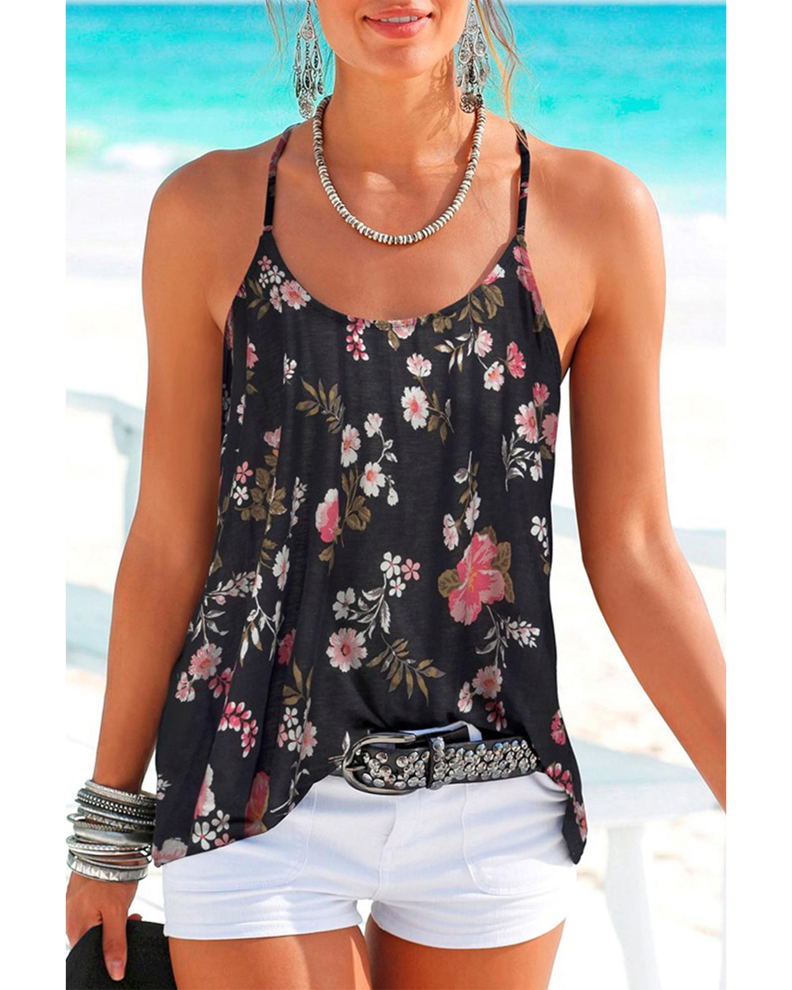 This black floral tank top features a stylish spaghetti strap design with a strappy open back, creating a bold and elegant look. Its charming floral print adds a touch of grace, making it suitable for various outfits and occasions. The top is designed with a fitted silhouette that emphasizes a trendy style while ensuring comfort.
