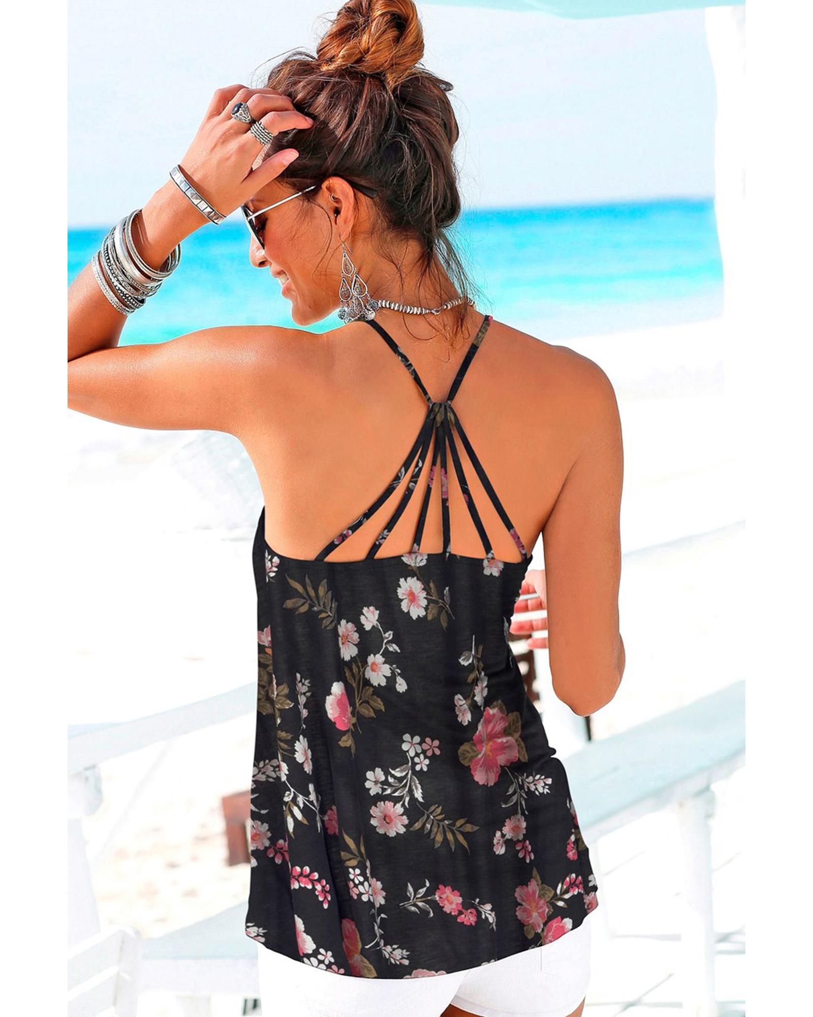 This black floral spaghetti strap tank top features a strappy open back design, combining a trendy fitted look with a charming floral print. It is suitable for pairing with various bottoms and offers a comfortable fit with high elasticity. The top is available in multiple sizes to accommodate different preferences.