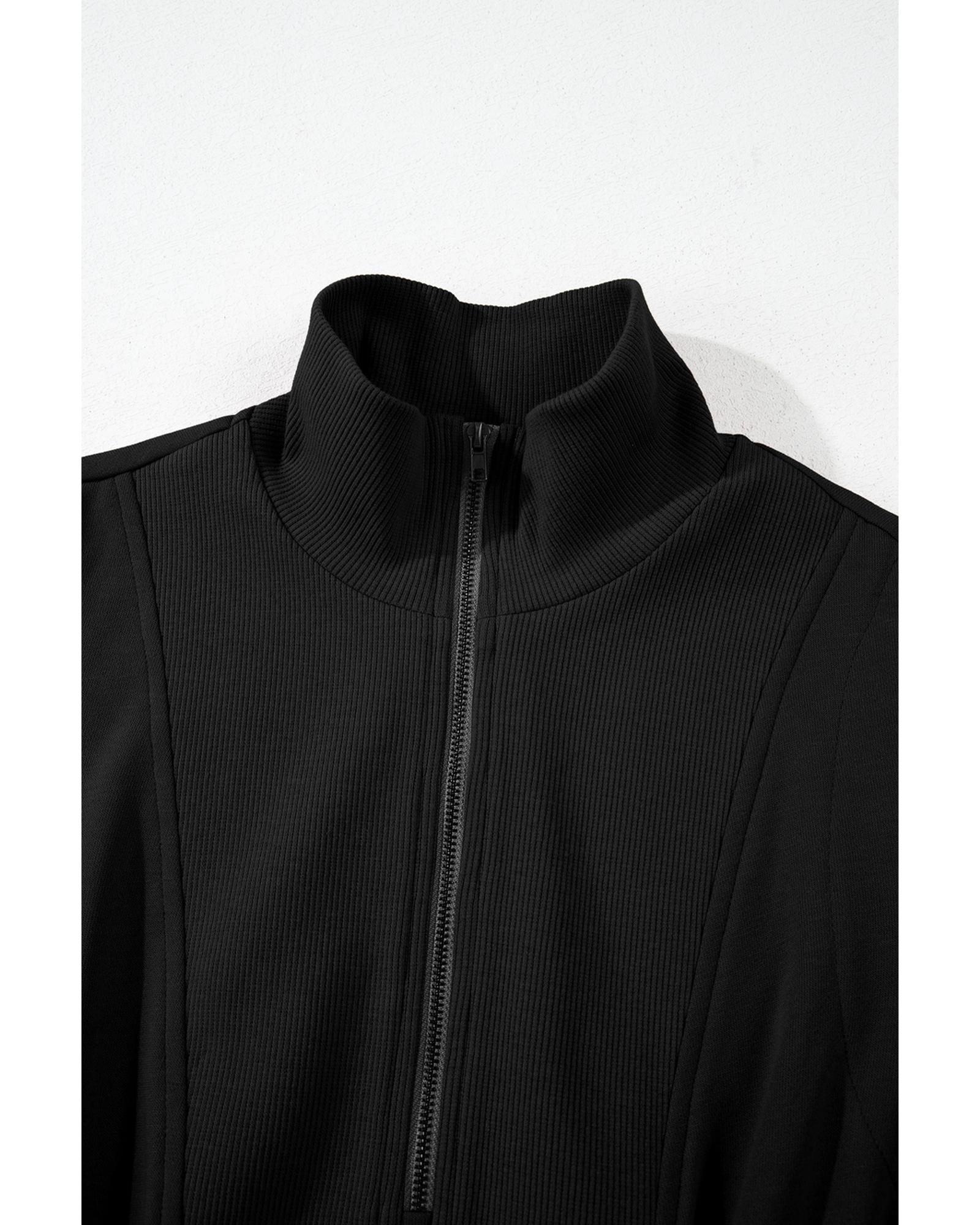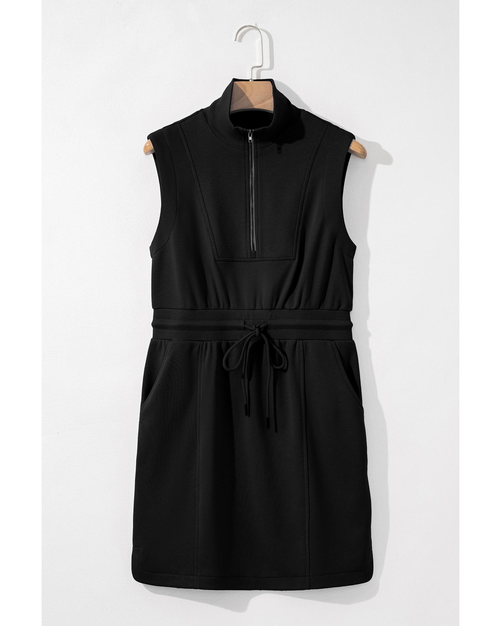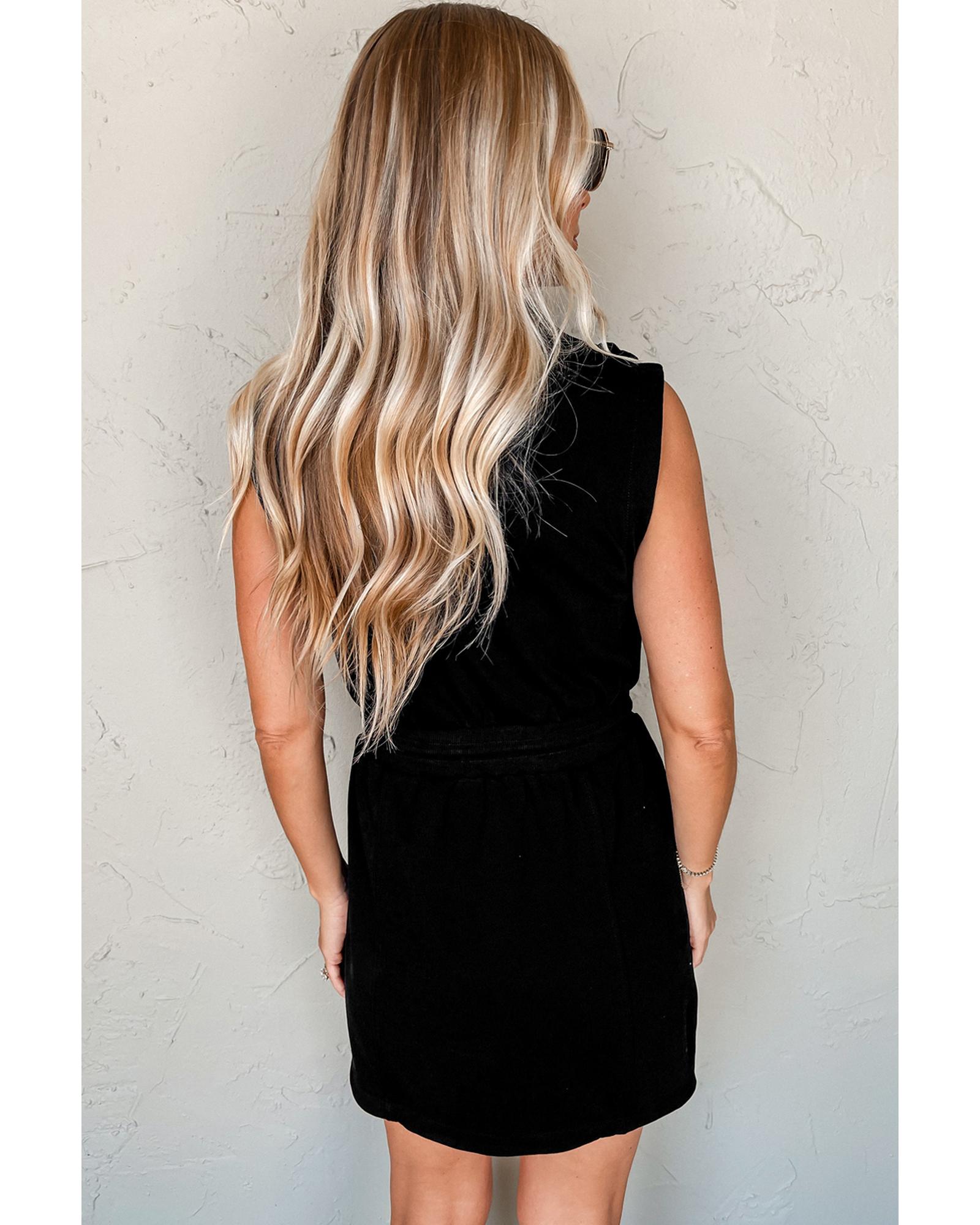 Black French Terry Zipped Collar Sleeveless Drawstring Waist Mini Dress – M