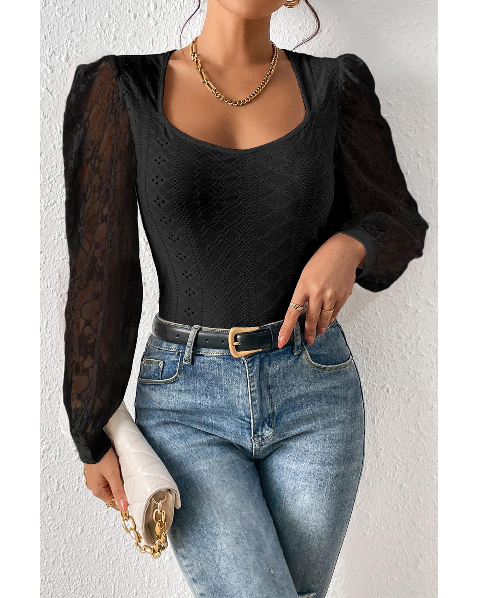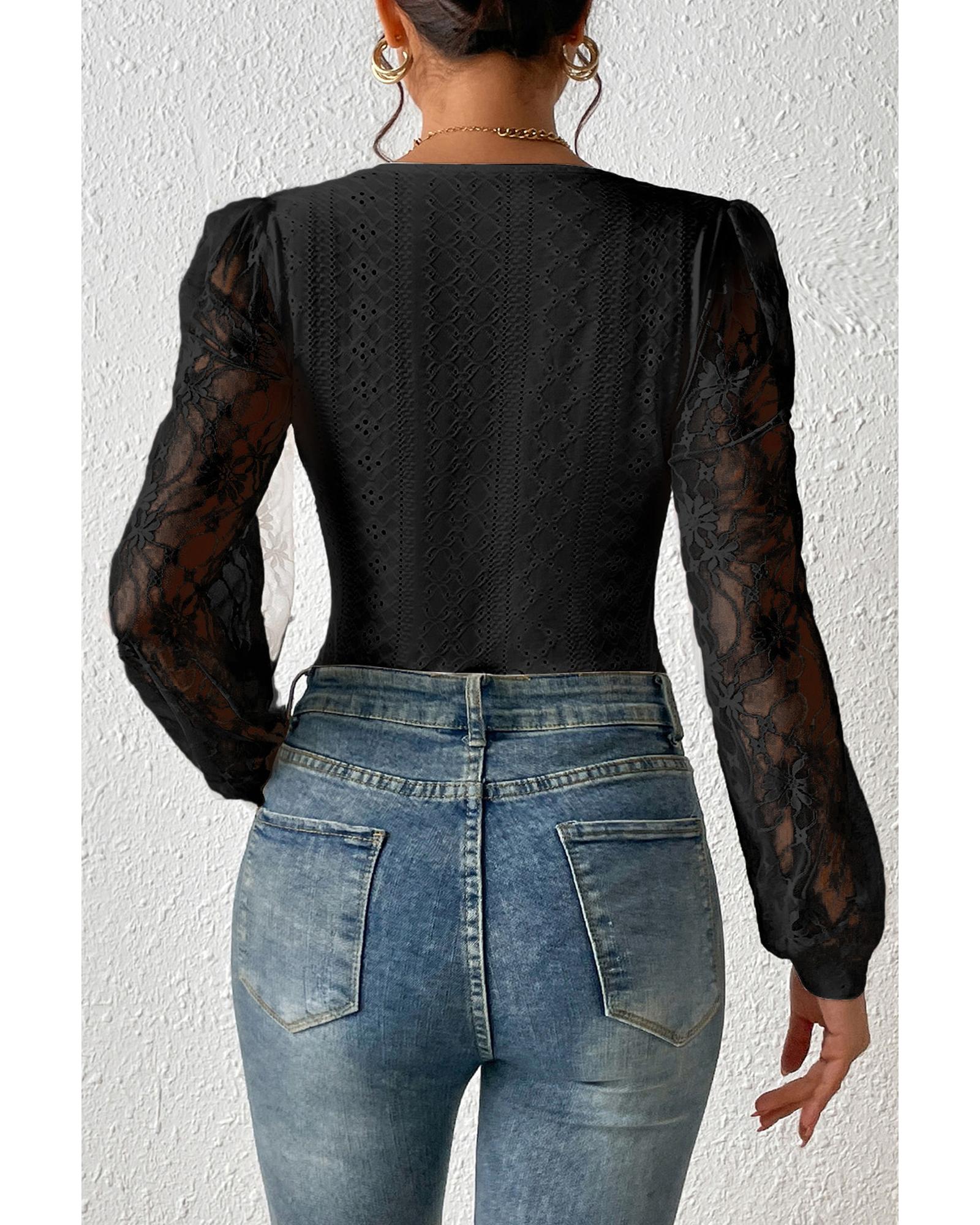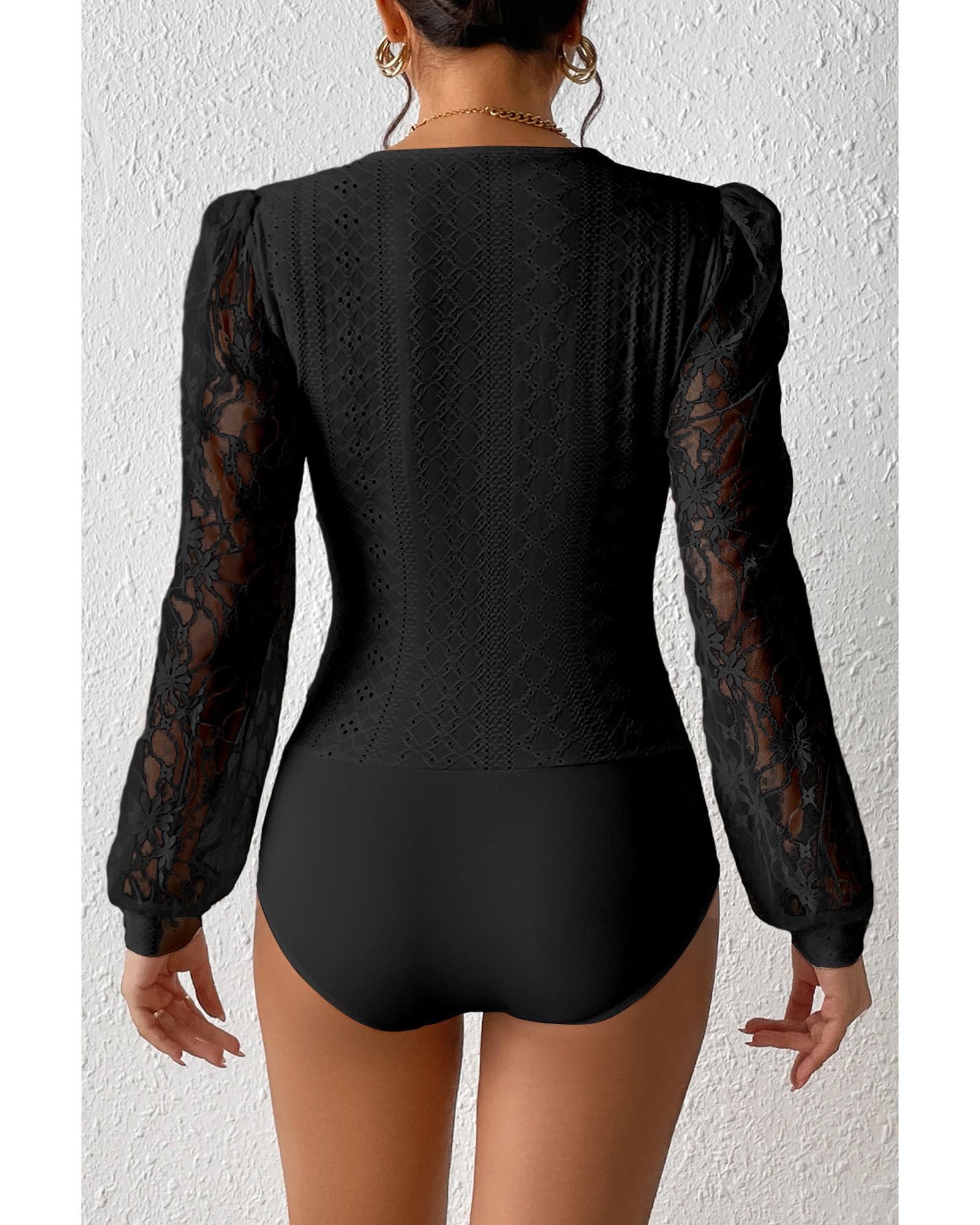 Black Frenchy Contrast Lace Bishop Sleeve Bodysuit – M