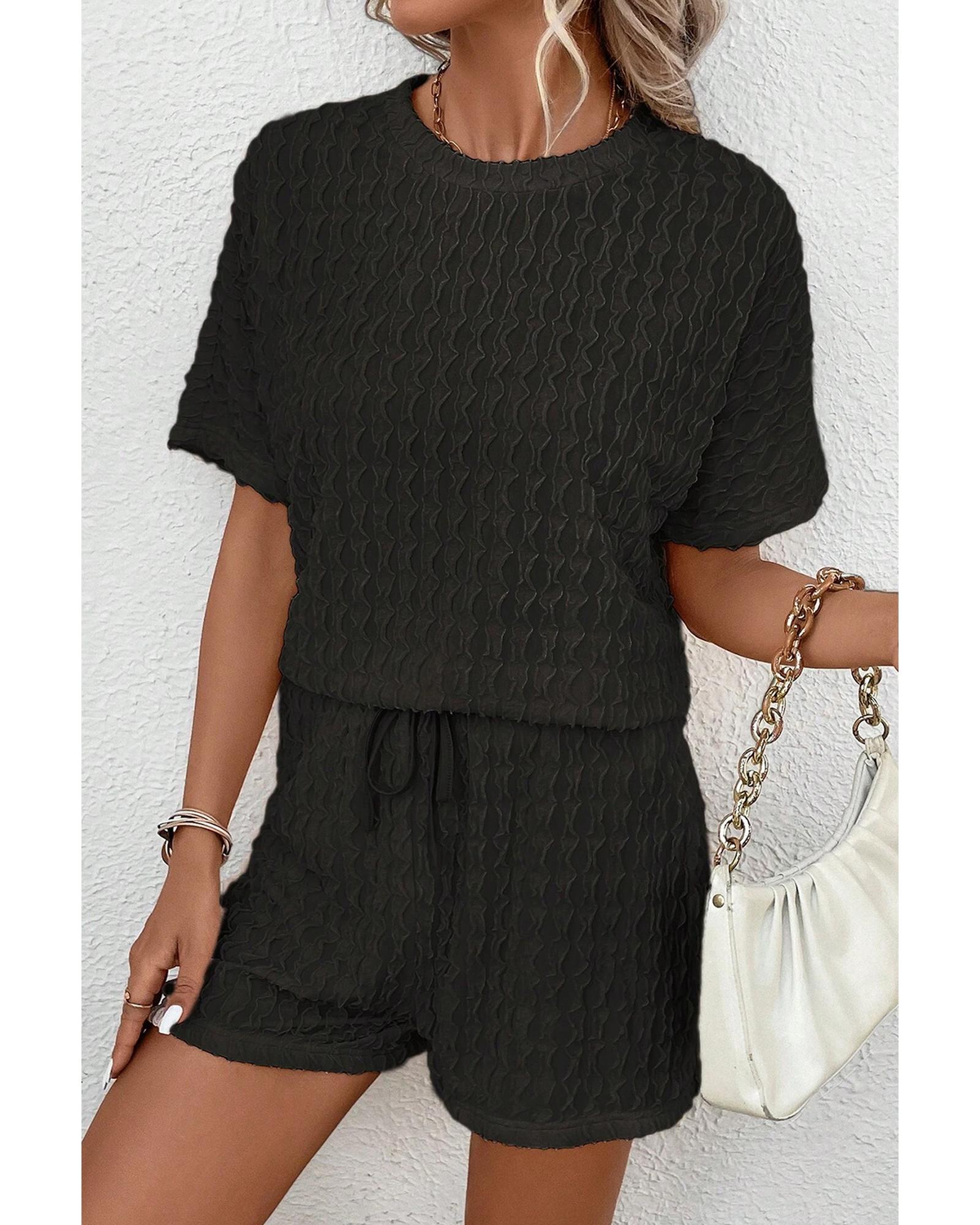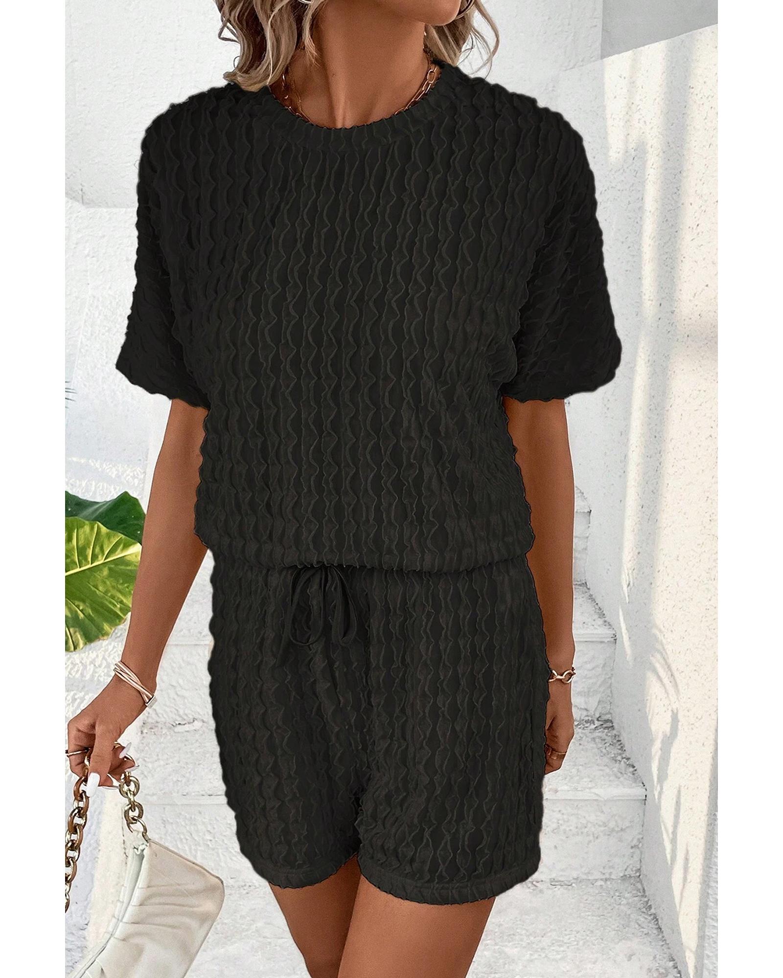 Black Frill Textured Short Sleeve Top and Drawstring Shorts Set – M