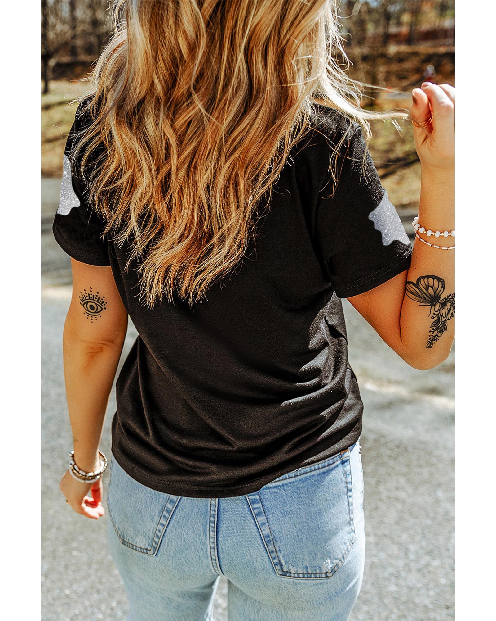 This Halloween T-shirt features a black glitter ghost pattern on a classic crew neck design, making it a festive and eye-catching choice for the holiday. The shirt offers a comfortable fit and can be styled easily with casual bottoms for a fun and spooky look.