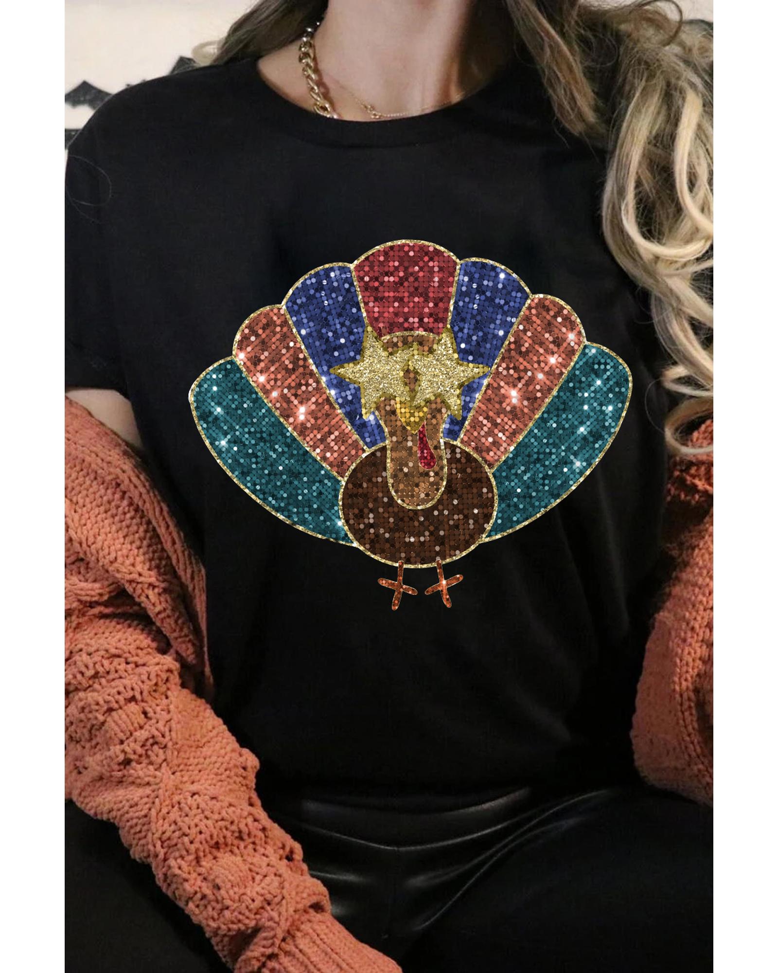Black Glitter Turkey Heat Transfer Printing Thanksgiving T Shirt – L