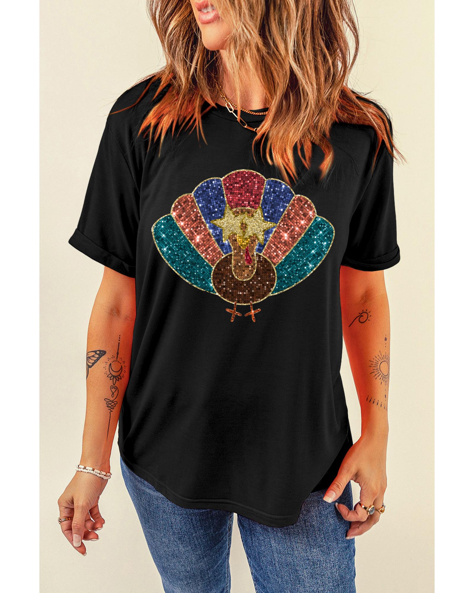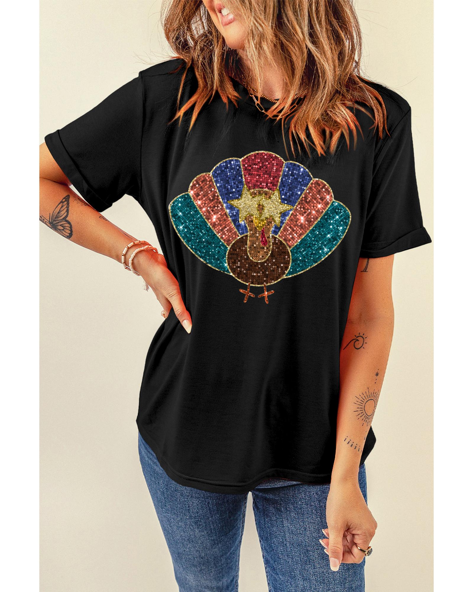 Black Glitter Turkey Heat Transfer Printing Thanksgiving T Shirt – XL