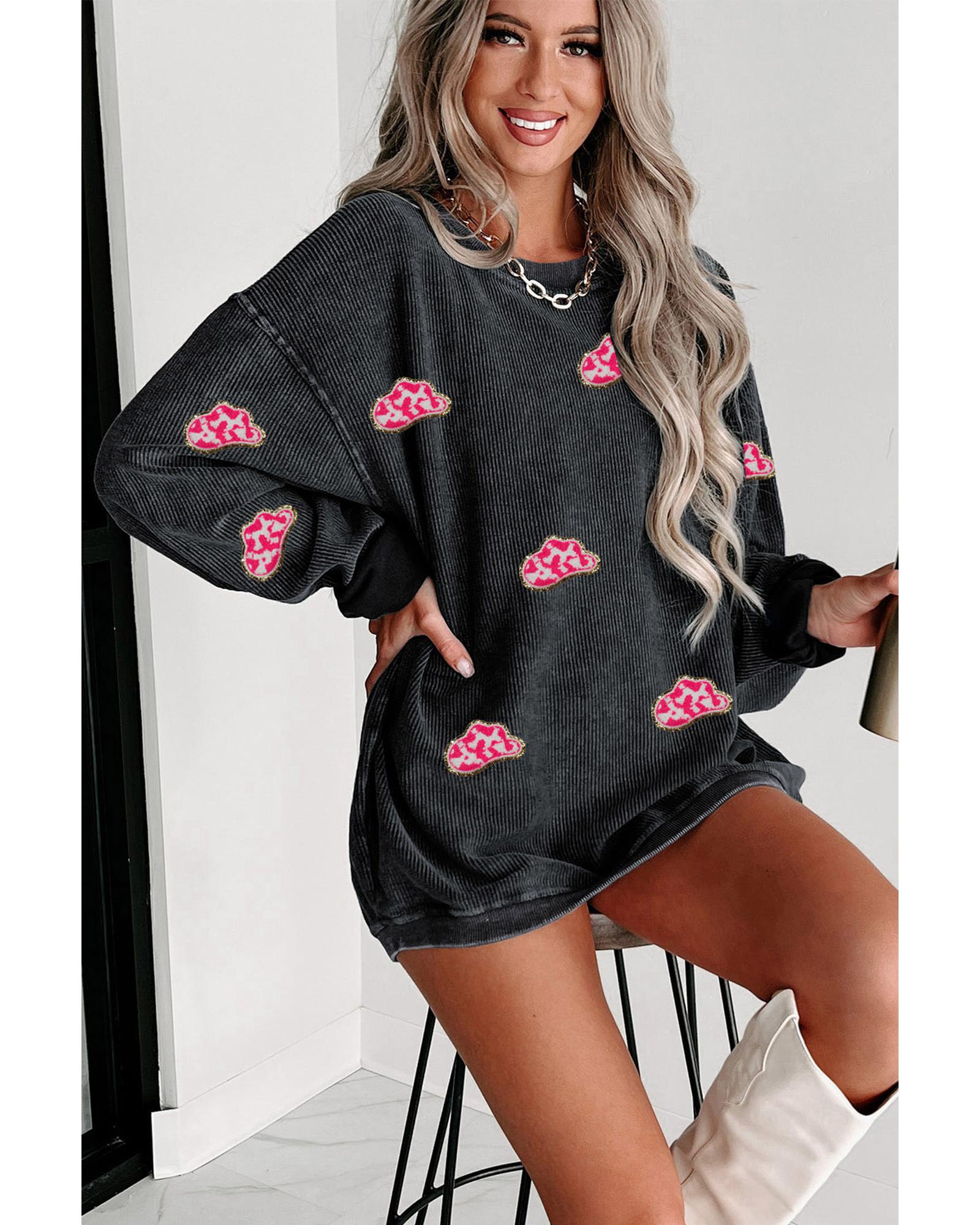 This stylish pullover sweatshirt features a trendy fitted design with a glittering cowboy hat patch pattern, inspired by western fashion. Made from rich textured corded fabric, it offers a warm and comfortable feel. The easy pullover style makes it a versatile addition to casual outfits, pairing well with jeans or other casual wear.