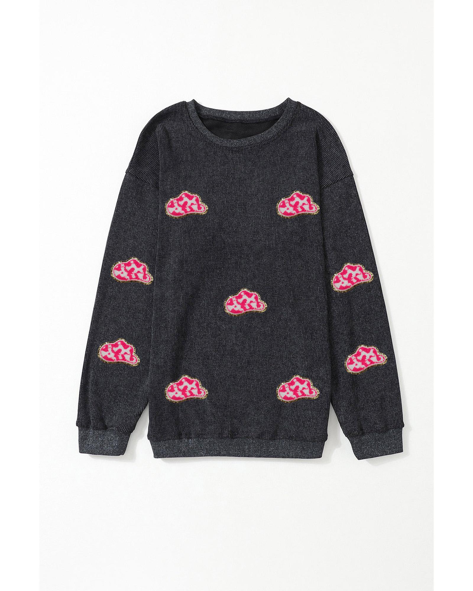 This stylish pullover sweatshirt features a glittering cowboy hat patch design, combining western-inspired fashion with a trendy fitted look. Made from rich textured corded fabric, it offers warmth and comfort, making it suitable for casual wear. The easy pullover style ensures convenience and versatility, pairing well with jeans or other casual outfits.