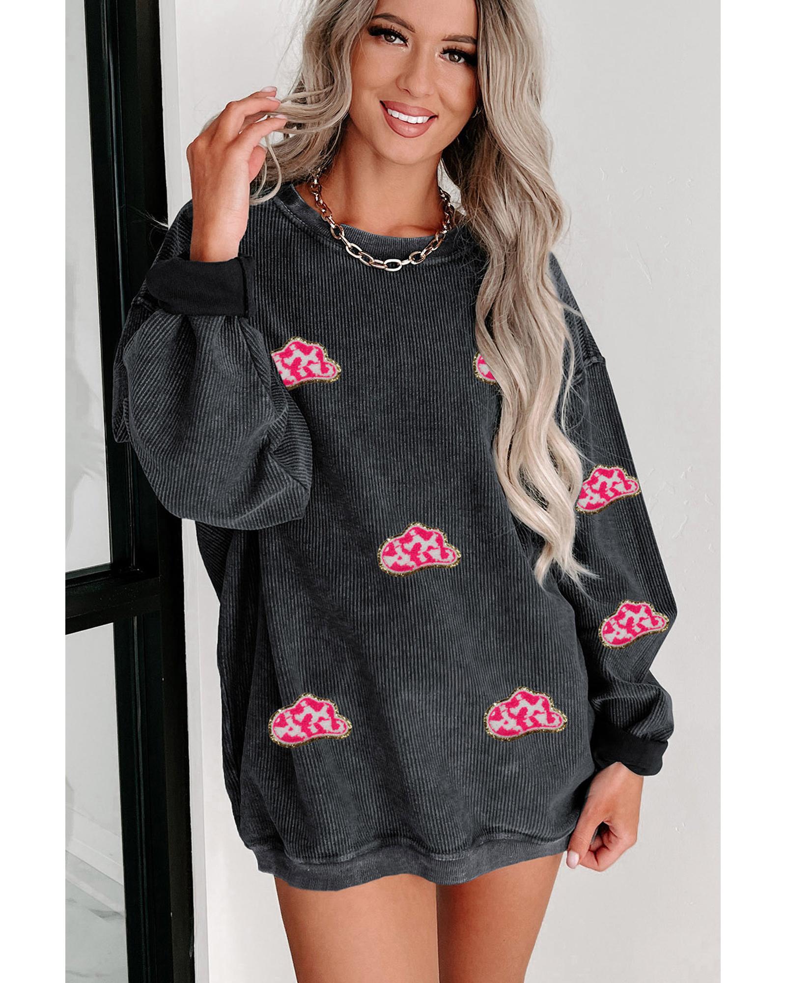 Black Glittering Cowboy Hat Patched Corded Pullover Sweatshirt – S