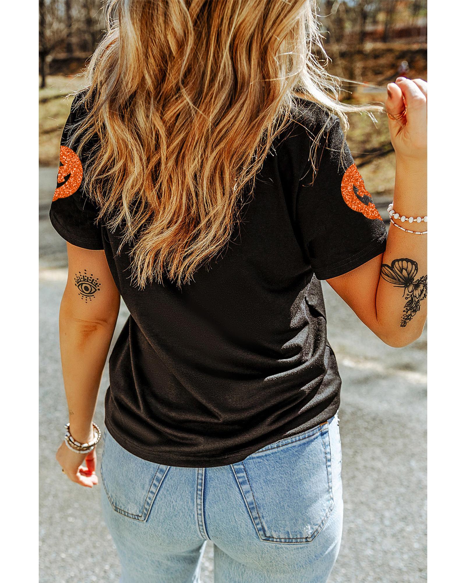 Black Glittering Pumpkin Face Graphic Crewneck Halloween T Shirt – L