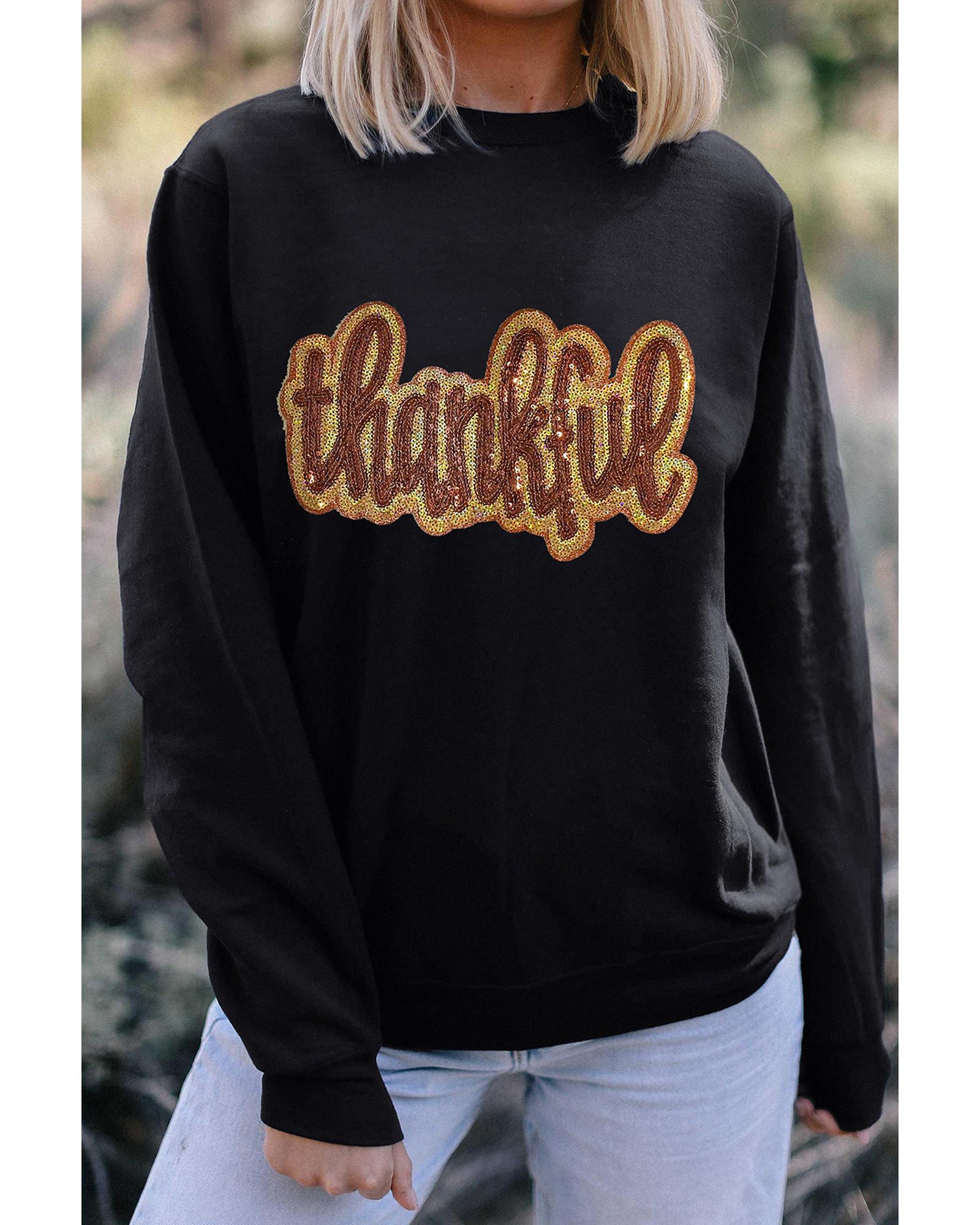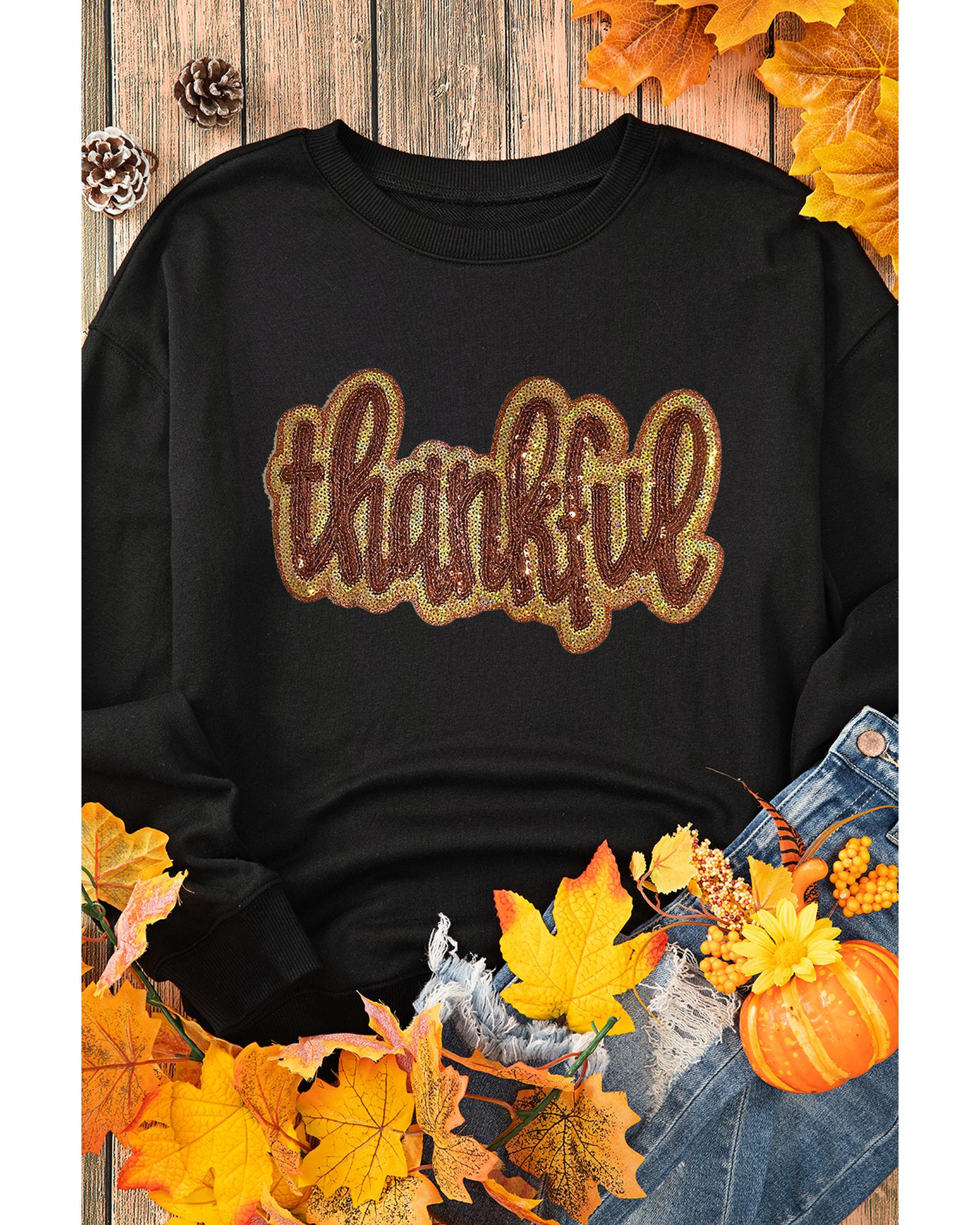 This black glittering sweatshirt features a thankful graphic design, making it a cozy and festive choice for the harvest season. Its dropped shoulder and baggy fit provide comfort and a trendy look, suitable for expressing gratitude during special occasions. The versatile style pairs well with various types of pants, jeans, or shorts, making it a great addition to your casual wardrobe.
