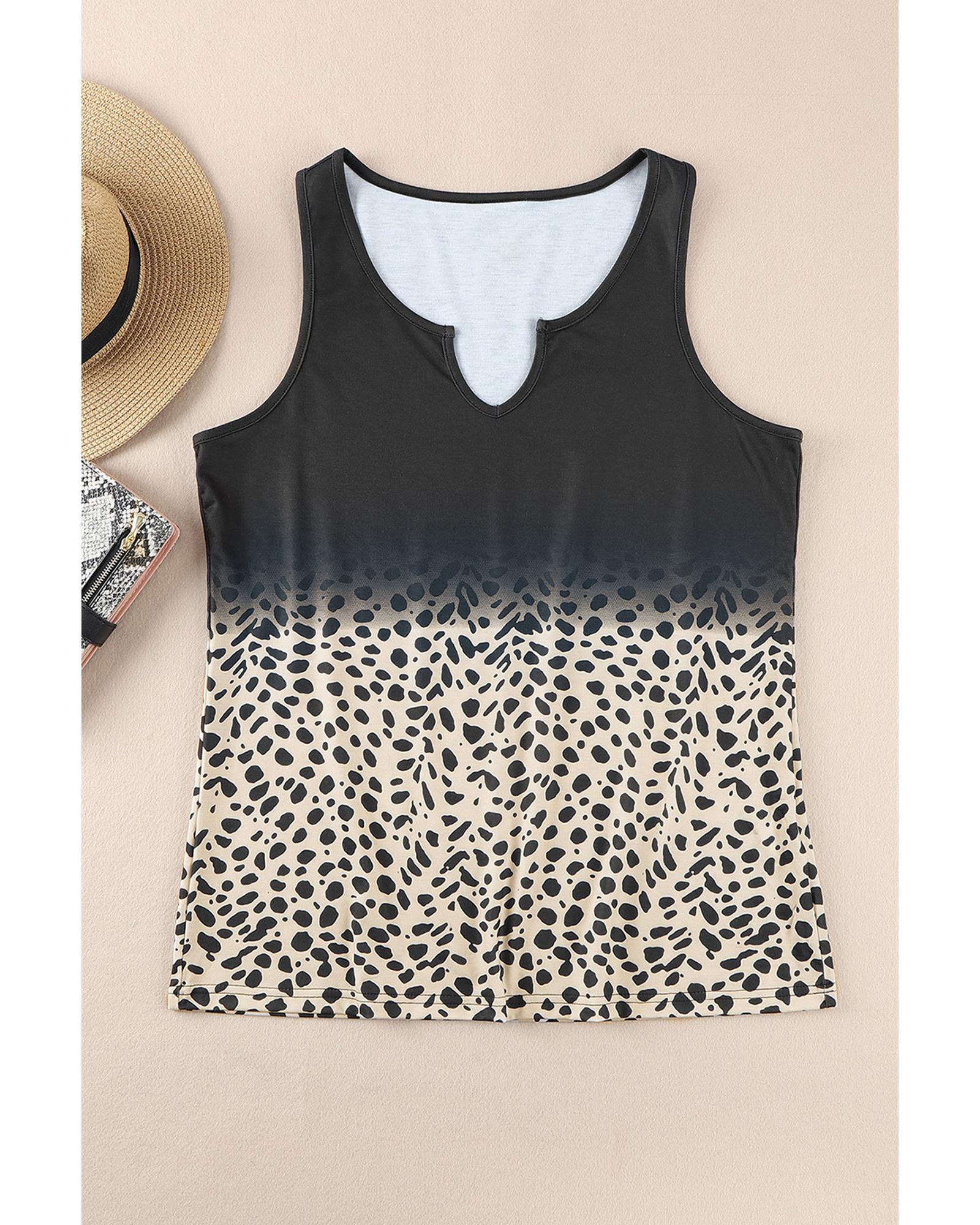 This stylish tank top features a trendy gradient leopard print design with a split neck detail, offering a chic and modern look. Crafted from high-quality materials, it is perfect for women seeking a fashionable and comfortable outfit.