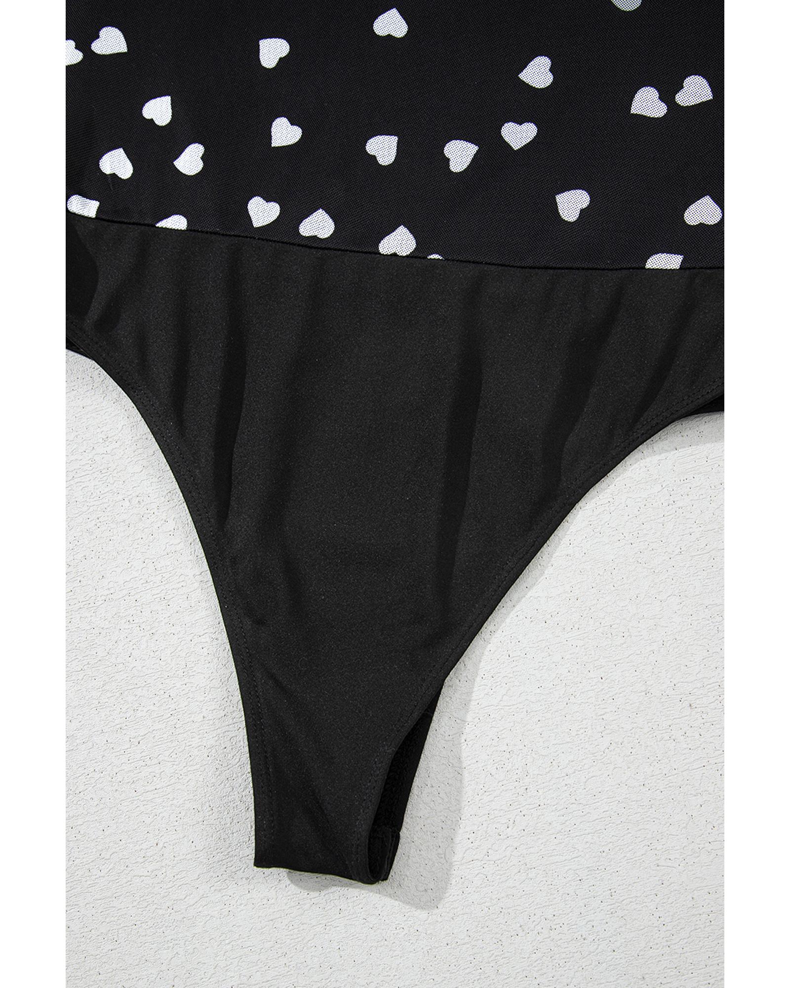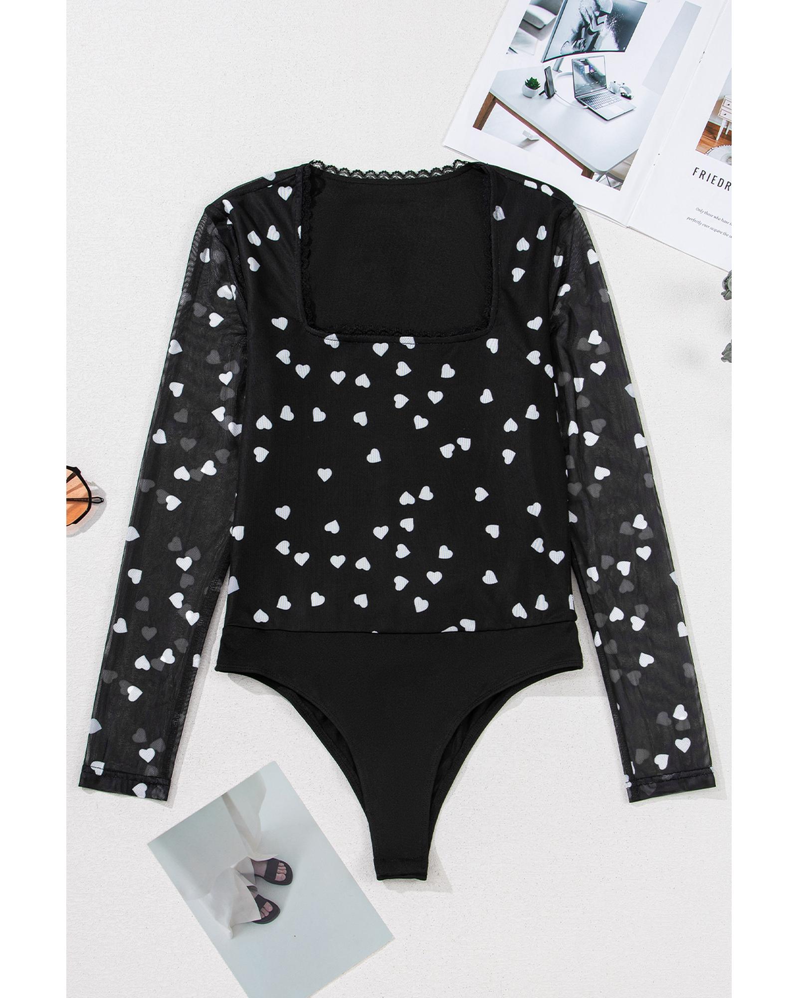 Black Heart Shape Mesh Patchwork Square Neck Bodysuit – S