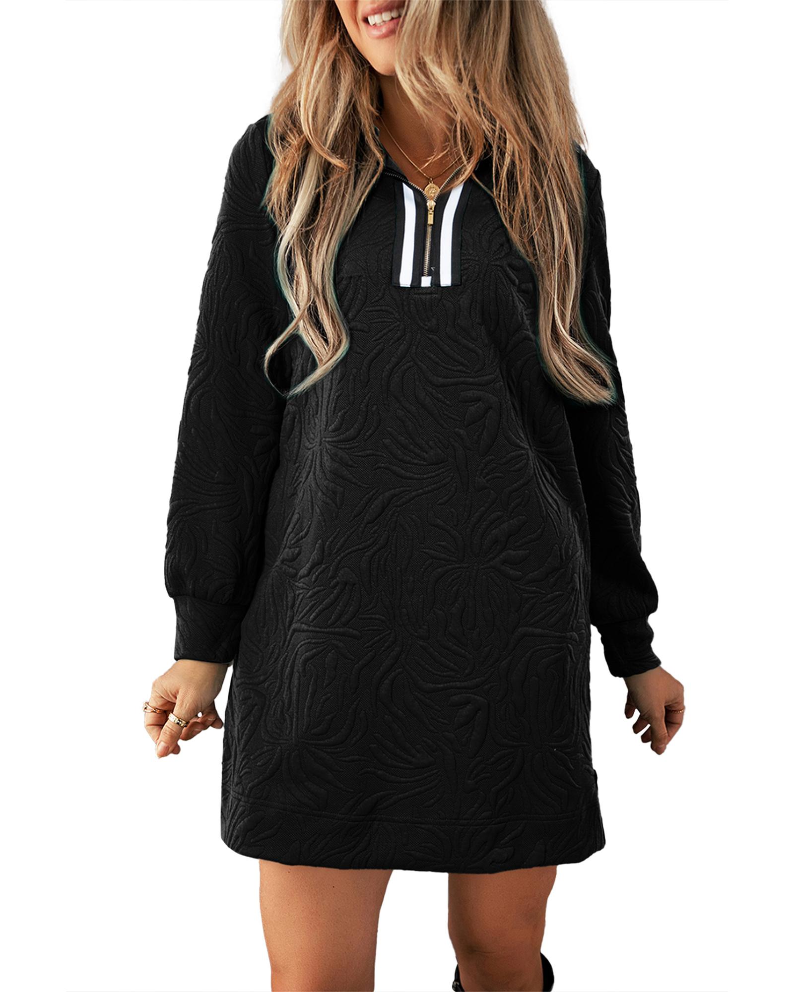 This mini dress features a textured jacquard fabric with a modern quarter zipper detail, offering a chic and stylish look suitable for various daily occasions. Its versatile shift silhouette flatters different body types and can be easily paired with tights and heels for a polished appearance.