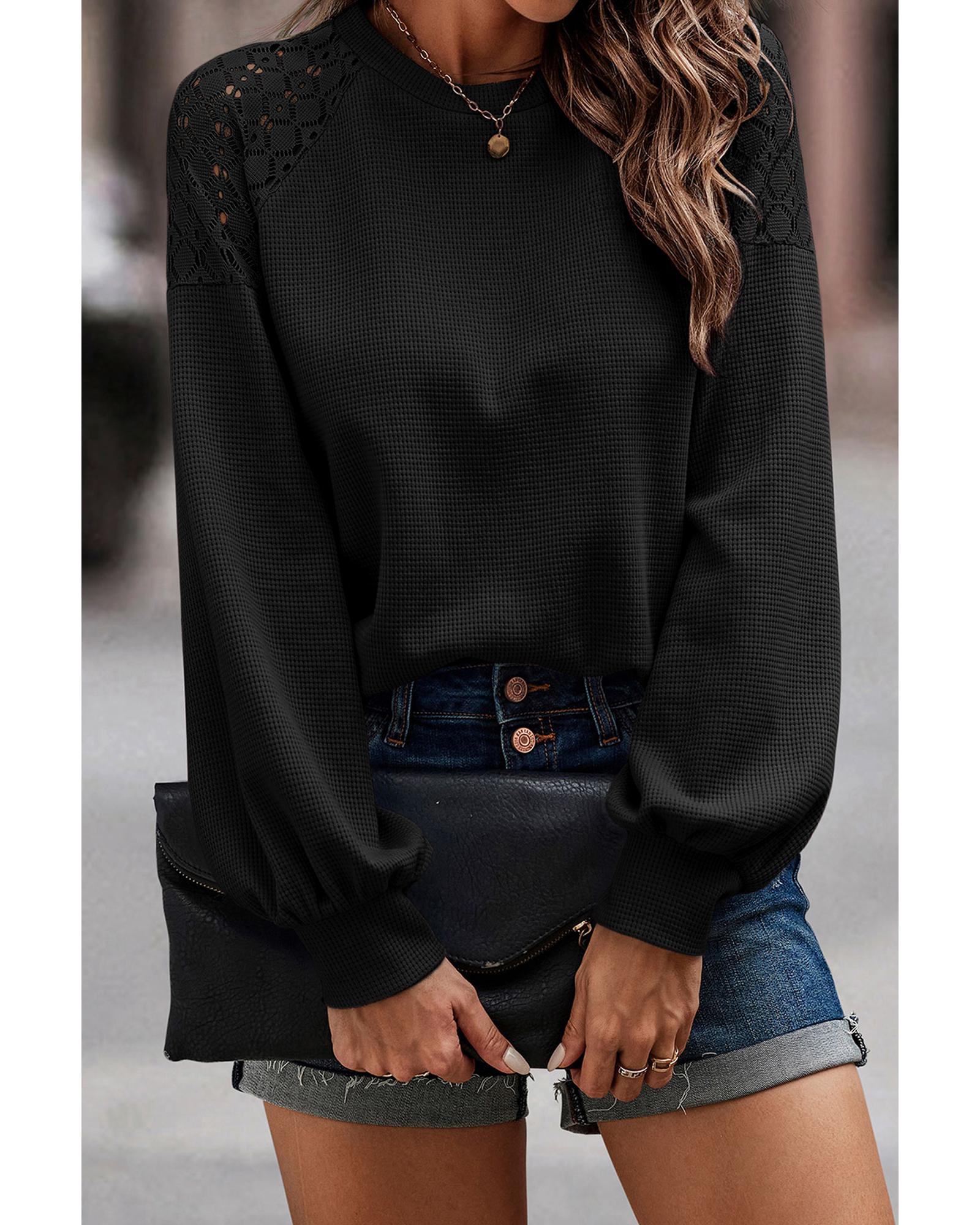 This black lace long sleeve pullover features a textured fabric design that adds depth and a stylish touch. Its unisex fit makes it suitable for both men and women, offering a trendy and comfortable look. The pullover is crafted from a blend of polyester and elastane, ensuring flexibility and durability.