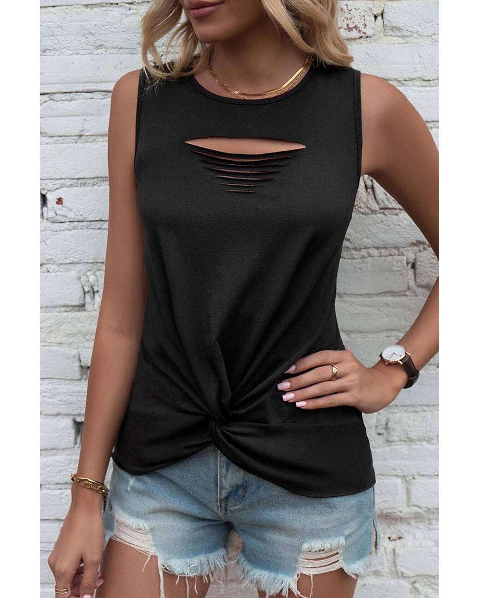 This stylish tank top features a trendy fitted design with unique laser cut slits and a twist front detail, creating a visually appealing look. Made from breathable and skin-friendly fabric, it offers comfort and versatility, making it suitable for various outfits and occasions.