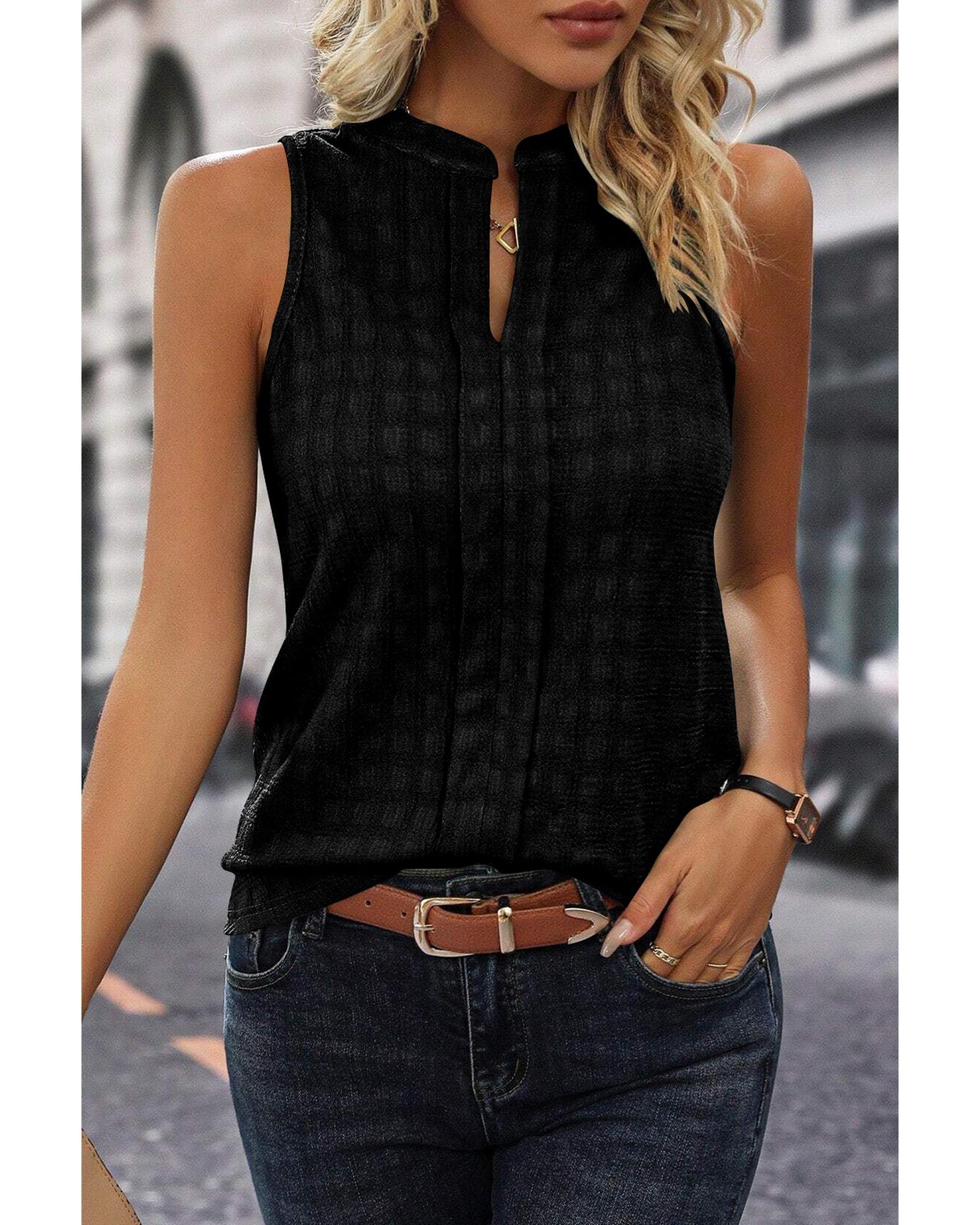 This split neck tank top features a stylish lattice textured fabric and a sleeveless design, making it a versatile addition to your wardrobe. Its fitted silhouette offers a trendy look that can be easily paired with various bottoms for different occasions.