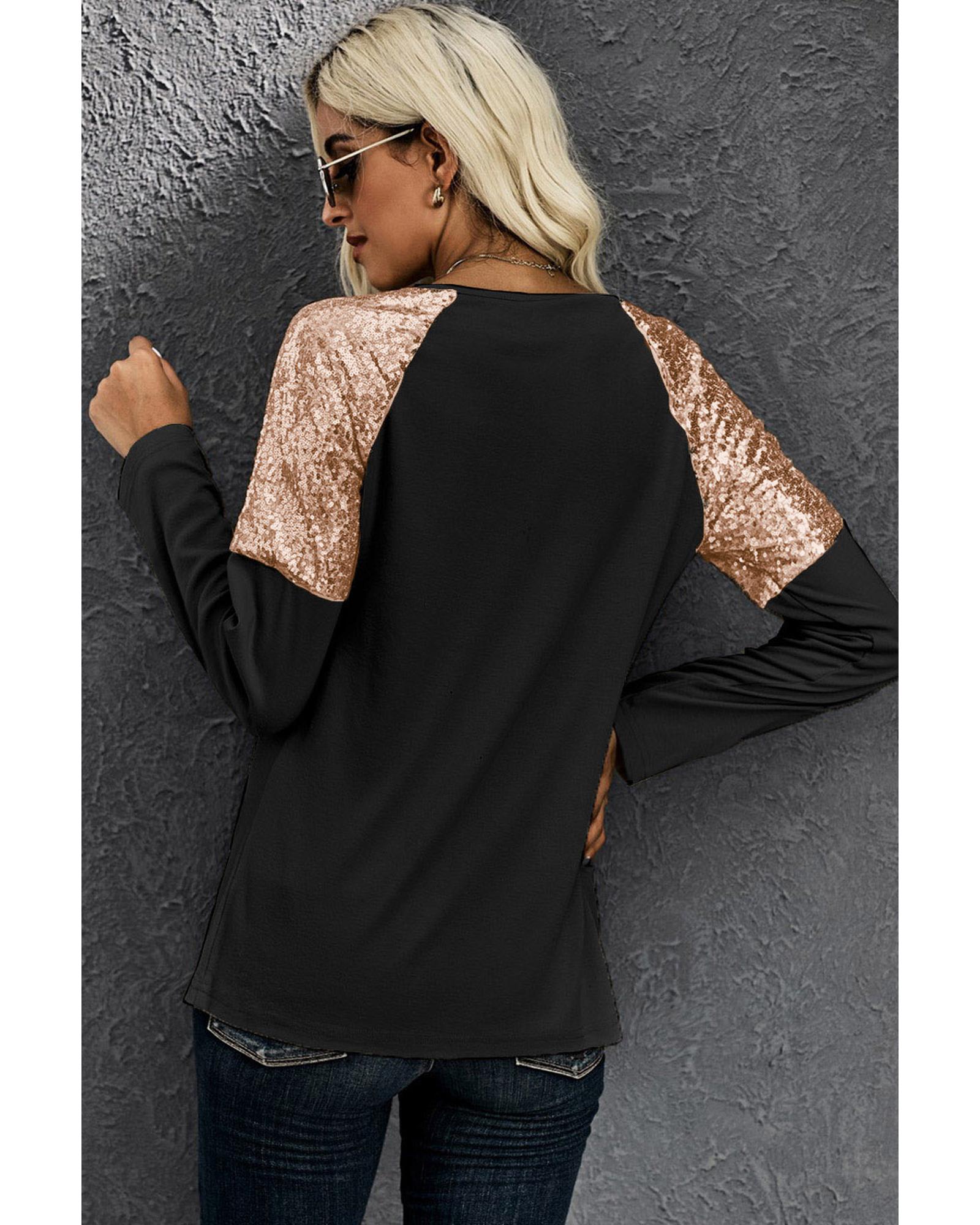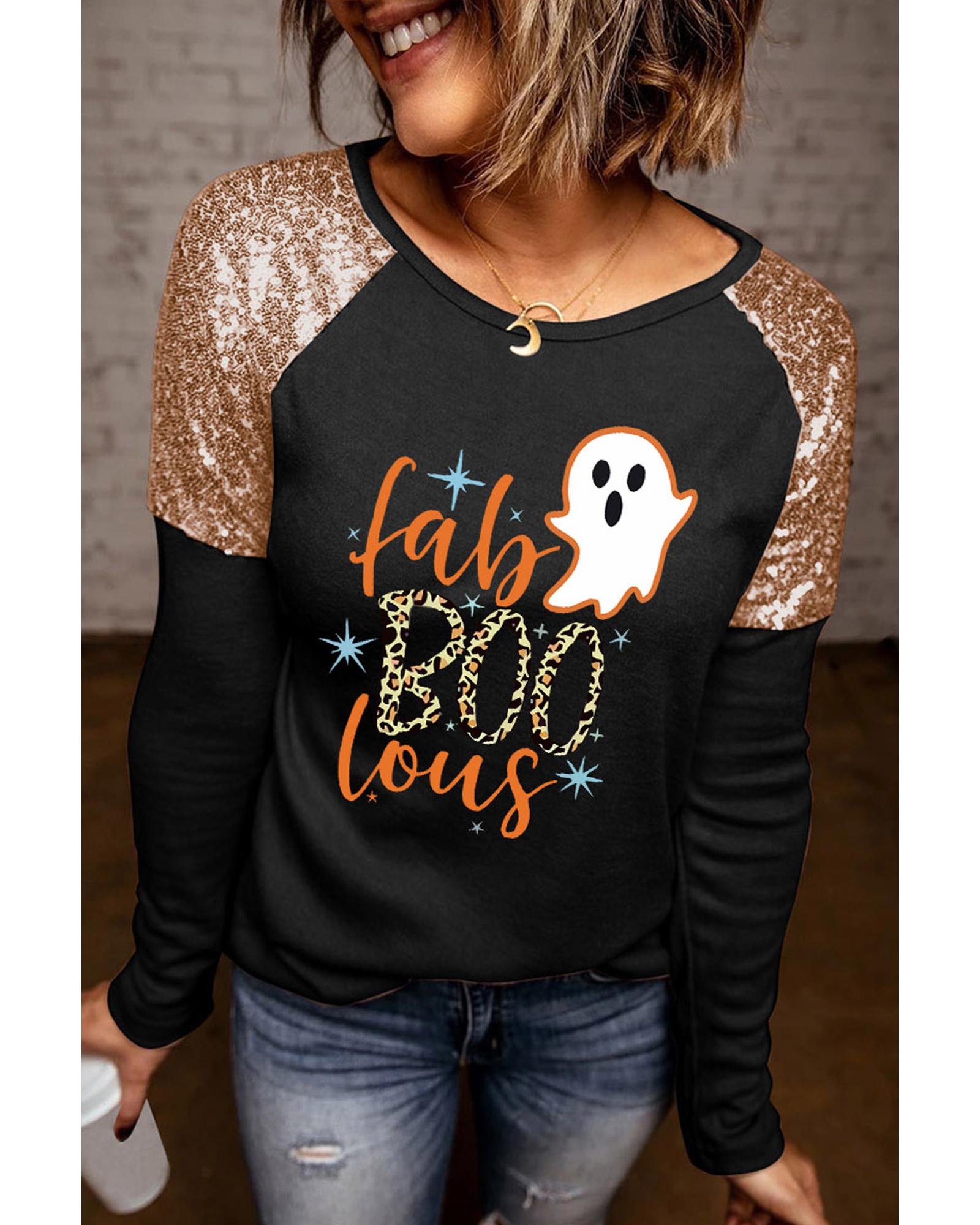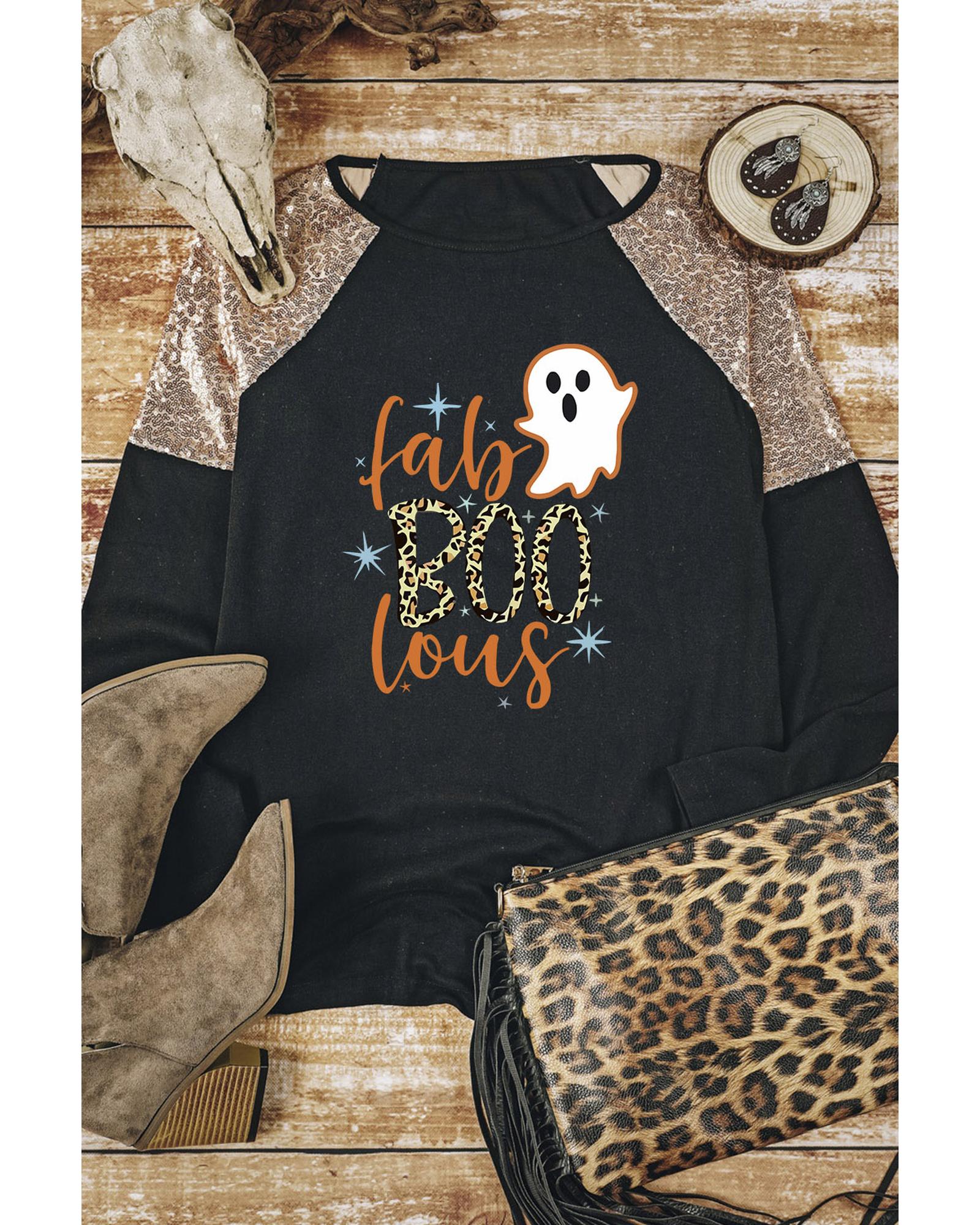 Black Leopard Boo Ghost Graphic Sequin Raglan Sleeve Top – S